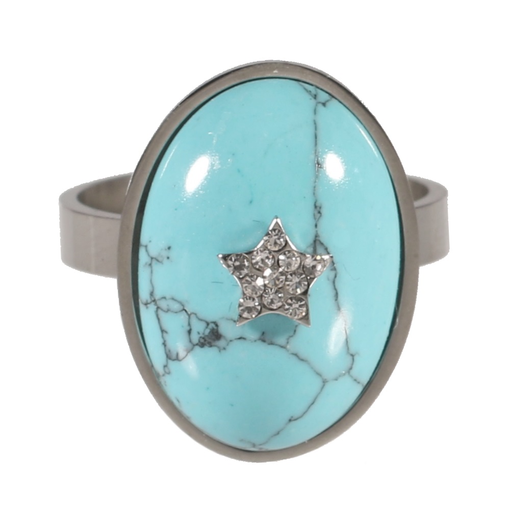 Bague en acier argenté, pierre d'imitation turquoise et étoile avec strass. Etoile Ovale  Adolescent Adulte Femme Fille Indémodable