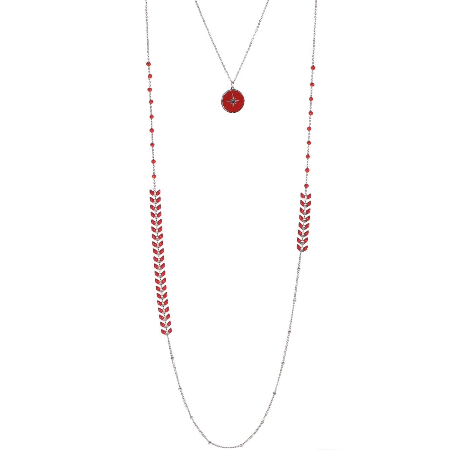 Description Collier sautoir double rangs avec pastille ronde motif étoile et branche de laurier en acier 316L argenté et émail. Cliquez sur une matière, un thème, une couleur ou une collection pour voir tous les articles associés.