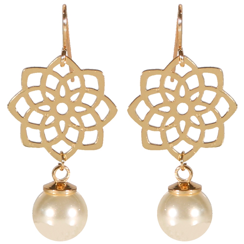 Description Boucles d'oreilles fantaisie pendantes avec rosace en métal doré et perles synthétiques. Cliquez sur une matière, un thème, une couleur ou une collection pour voir tous les articles associés.