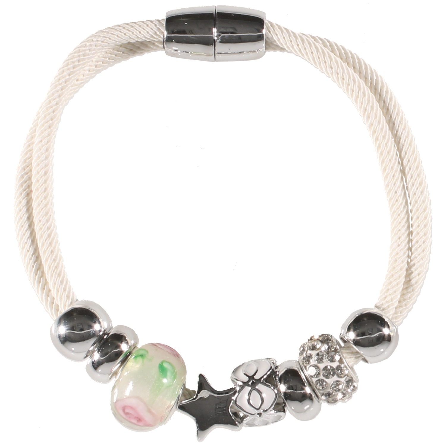 Bracelet fantaisie charm's double rangs avec cordon en coton, étoile et perles en métal argenté, strass et en émail.