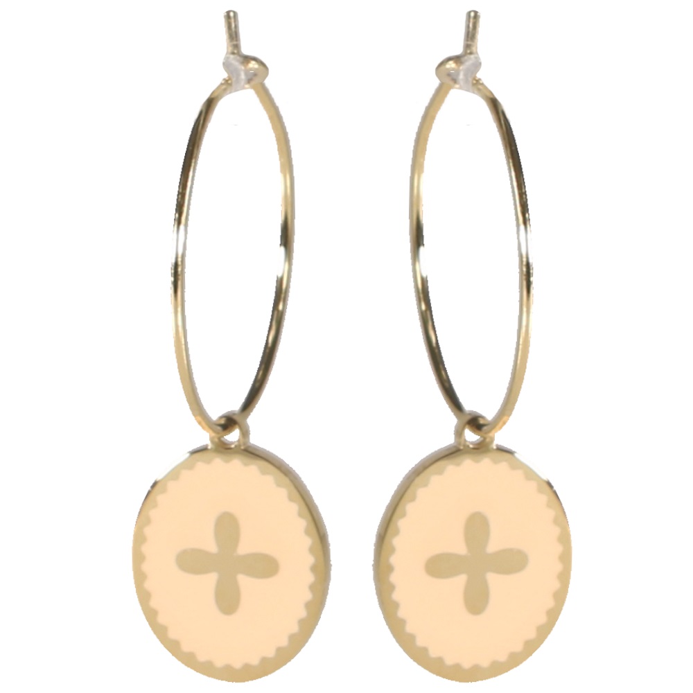 Boucles d'oreilles créoles avec pastilles motif croix en acier doré et émail.