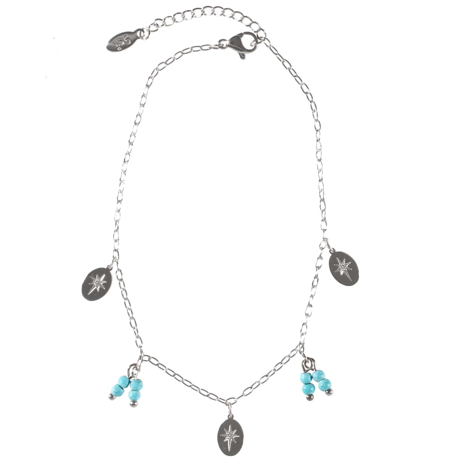 Description Bracelet chaîne de cheville avec pastilles ovales au motif étoile en acier argenté et perles de couleur turquoise. Cliquez sur une matière, un thème, une couleur ou une collection pour voir tous les articles associés.