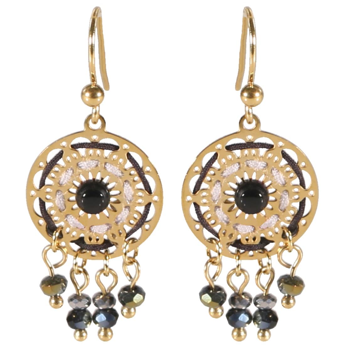 Boucles d'oreilles pendantes attrape rêve en acier doré, fils de textile et perles de couleur.