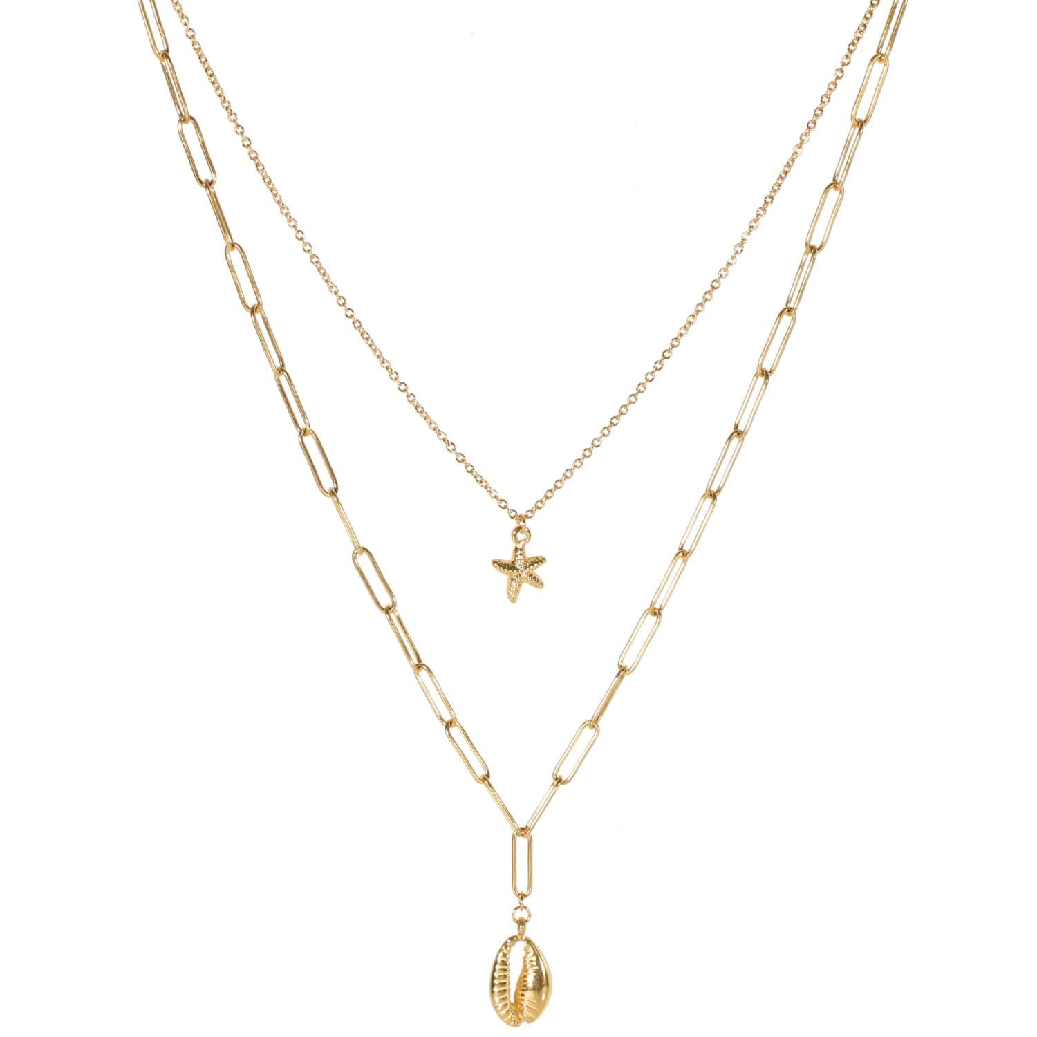 Description Collier double rangs composé d'un collier de 37 cm de long avec un pendentif étoile de mer en acier doré, ainsi qu'un collier de 48 cm de long avec pendentif coquillage cauri en acier doré. L'ensemble peut se régler jusqu'à 4 cm. Longueur 37+4 cm [Guide des tailles] Matière(s) Acier . L'acier utilisé dans la bijouterie existe sous plusieurs qualités. Nous utilisons principalement la qualité 316L, qualité qui est utilisée en chirurgie. Cet acier est donc inoxydable et reste très résistant. Fermoir Mousqueton À noter Etoile de mer 8x10 mm et coquillage 10x15 mm Couleur(s) dominante(s) Doré Public Adolescent , Adulte . Genre Femme , Fille . Saison Eté . Thème(s) Nature . Collection Seaside Cliquez sur une matière, un thème, une couleur ou une collection pour voir tous les articles associés.