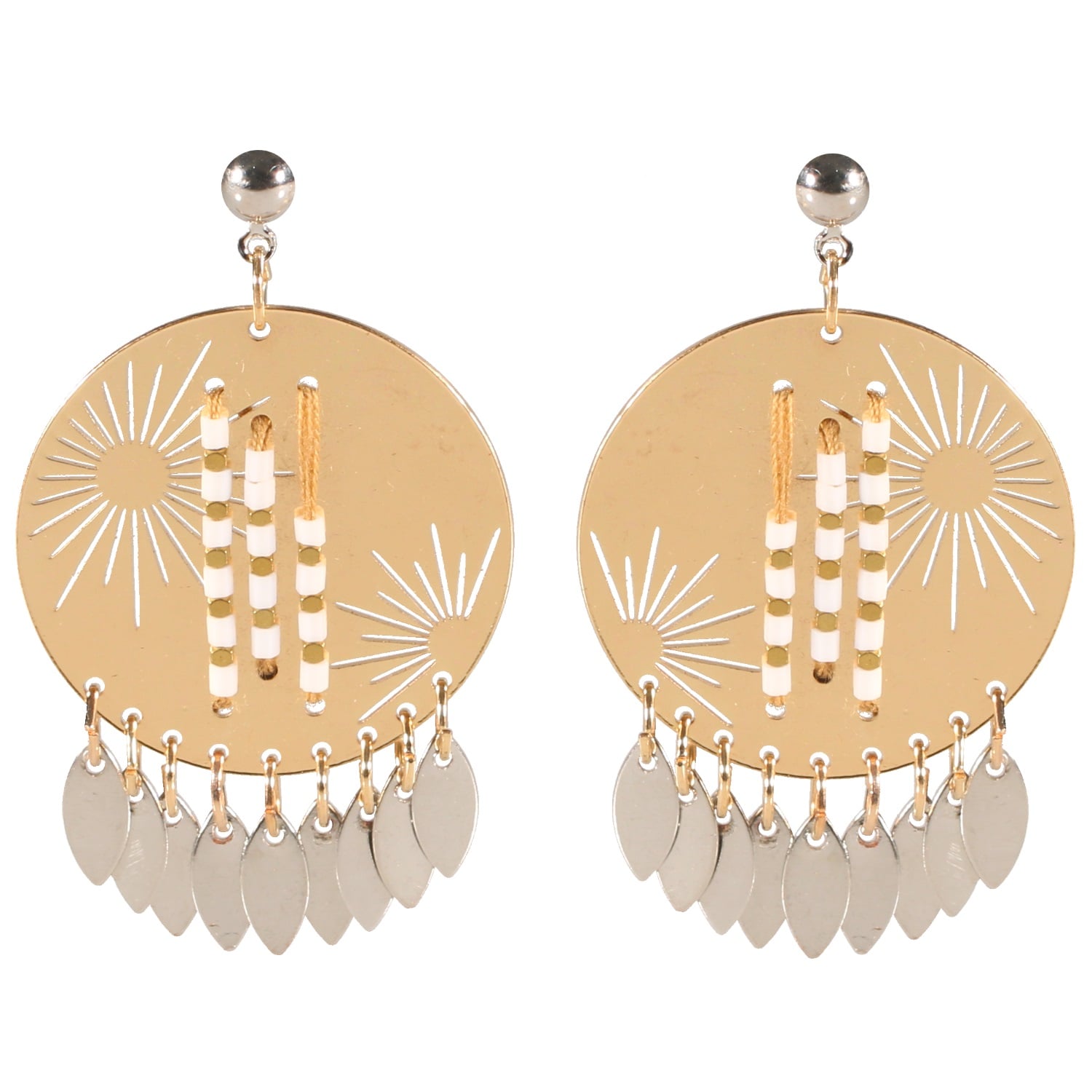 Description Boucles d'oreilles fantaisie en métal doré, pampilles en métal argenté et perles de couleur passées sur des fils en textile. Cliquez sur une matière, un thème, une couleur ou une collection pour voir tous les articles associés.