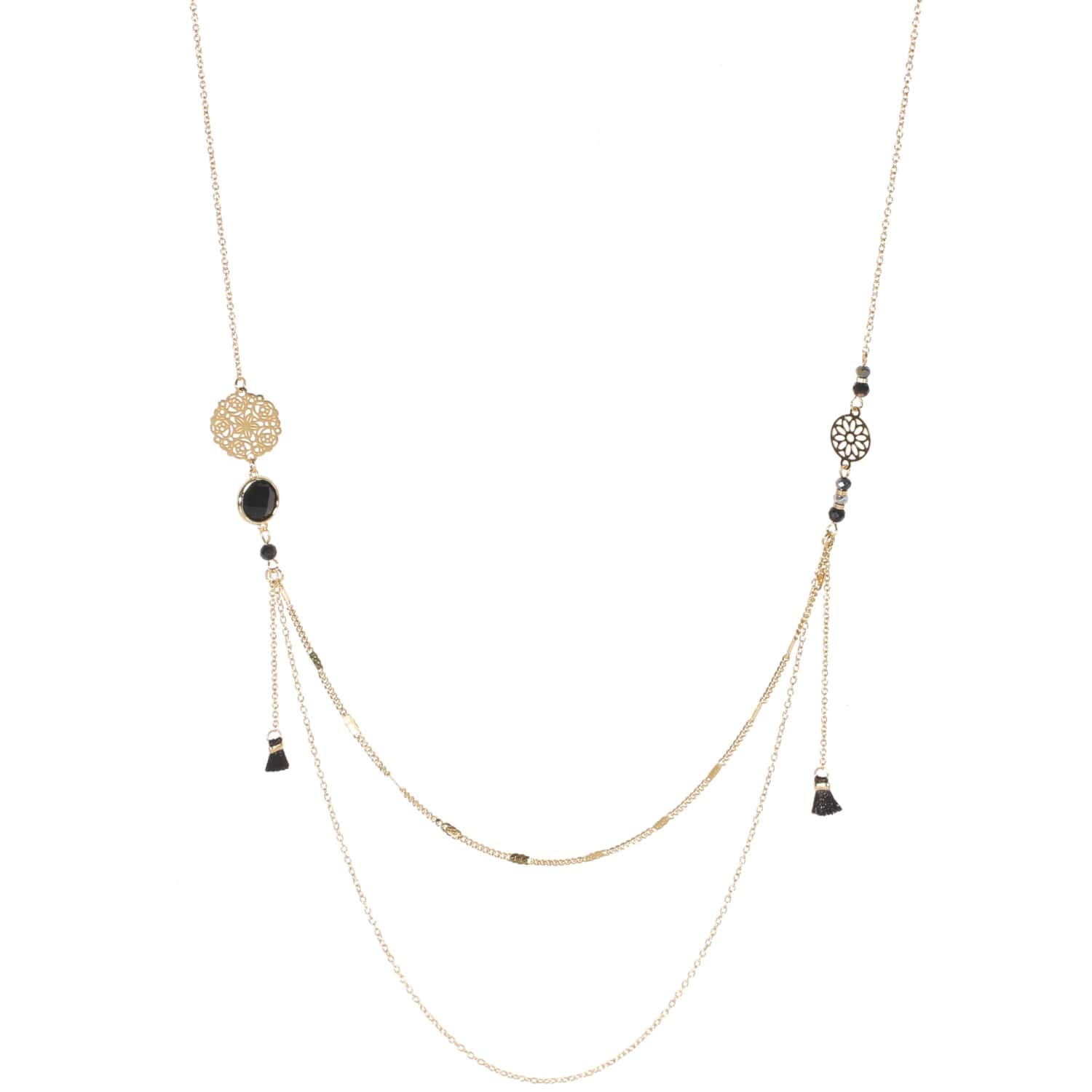 Collier sautoir composé d'un collier de 58 cm de long avec médaillons ajourés de motif en acier doré, pierre de couleur noire sertie clos, pompon en textile et perles de couleur noire, ainsi qu'un collier chaîne en acier doré qui allonge le collier de 8 cm.