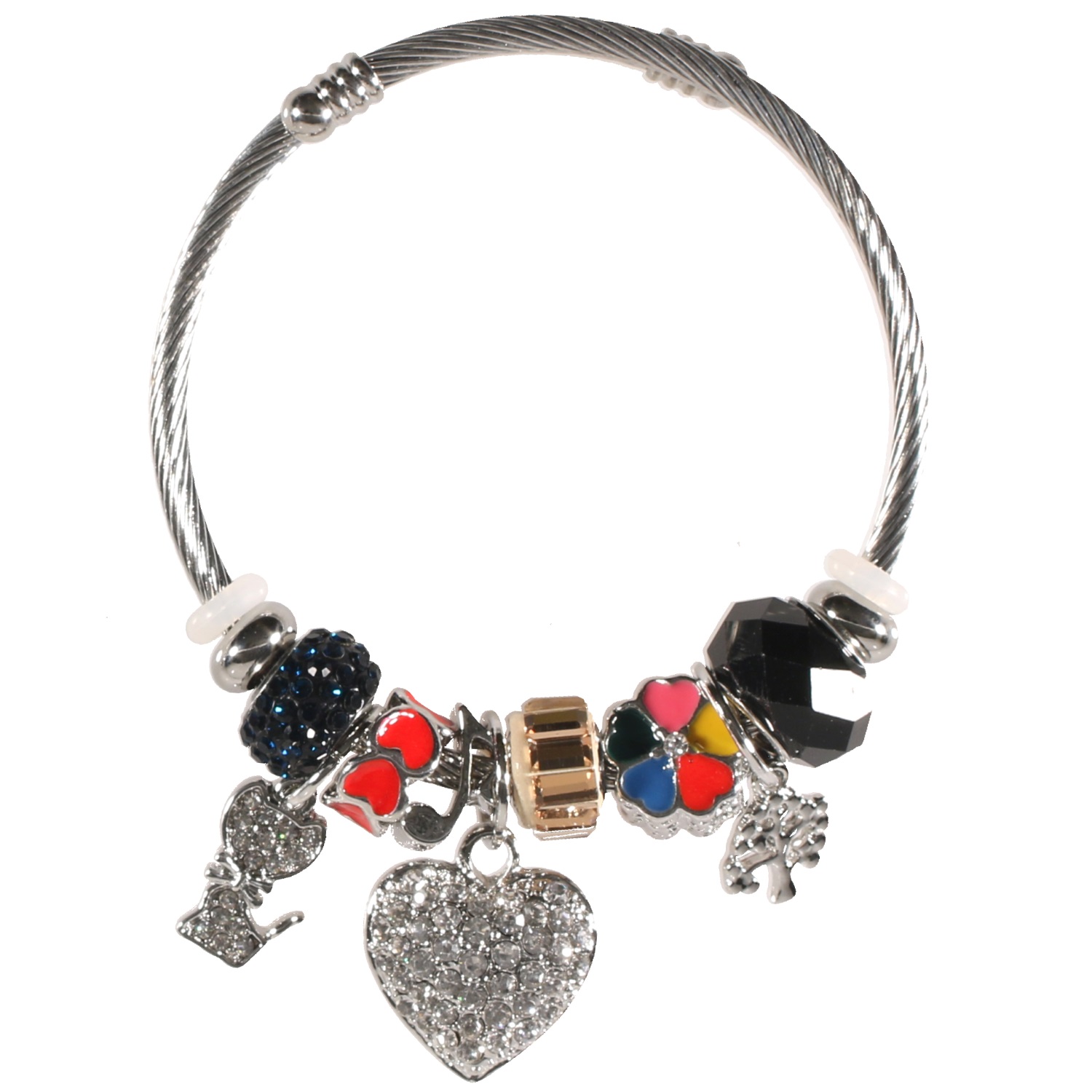 Bracelet fantaisie charm's avec breloques (Chaton, cœur, arbre, fleur...) en métal argenté, cristaux de couleur, émail et strass.