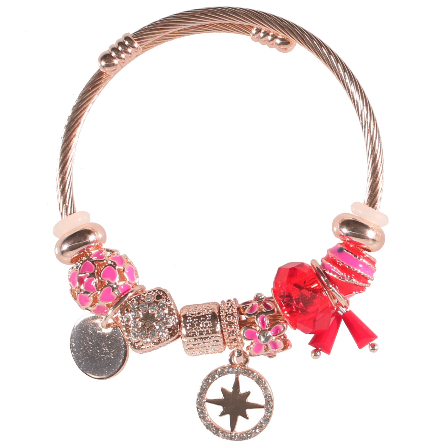 Bracelet fantaisie charm's avec breloques (Etoile, cœur, fleur...) en métal rosé, cristaux de couleur, émail et strass.