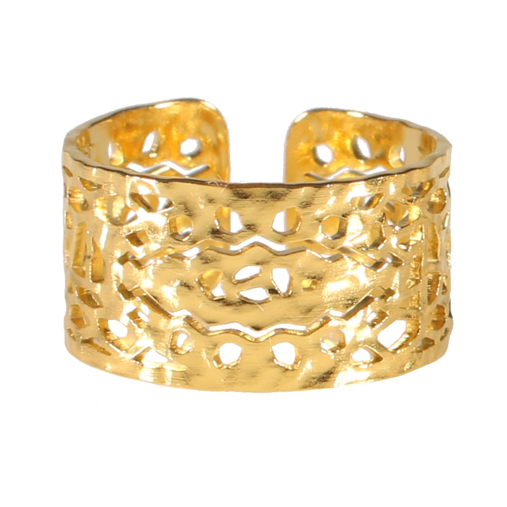 Description Bague ajourée en acier doré. Taille ajustable. Largeur 10 mm Matière(s) Acier . L'acier utilisé dans la bijouterie existe sous plusieurs qualités. Nous utilisons principalement la qualité 316L, qualité qui est utilisée en chirurgie. Cet acier est donc inoxydable et reste très résistant. Couleur(s) dominante(s) Doré Public Adolescent , Adulte . Genre Femme , Fille . Saison Indémodable . Cliquez sur une matière, un thème, une couleur ou une collection pour voir tous les articles associés.