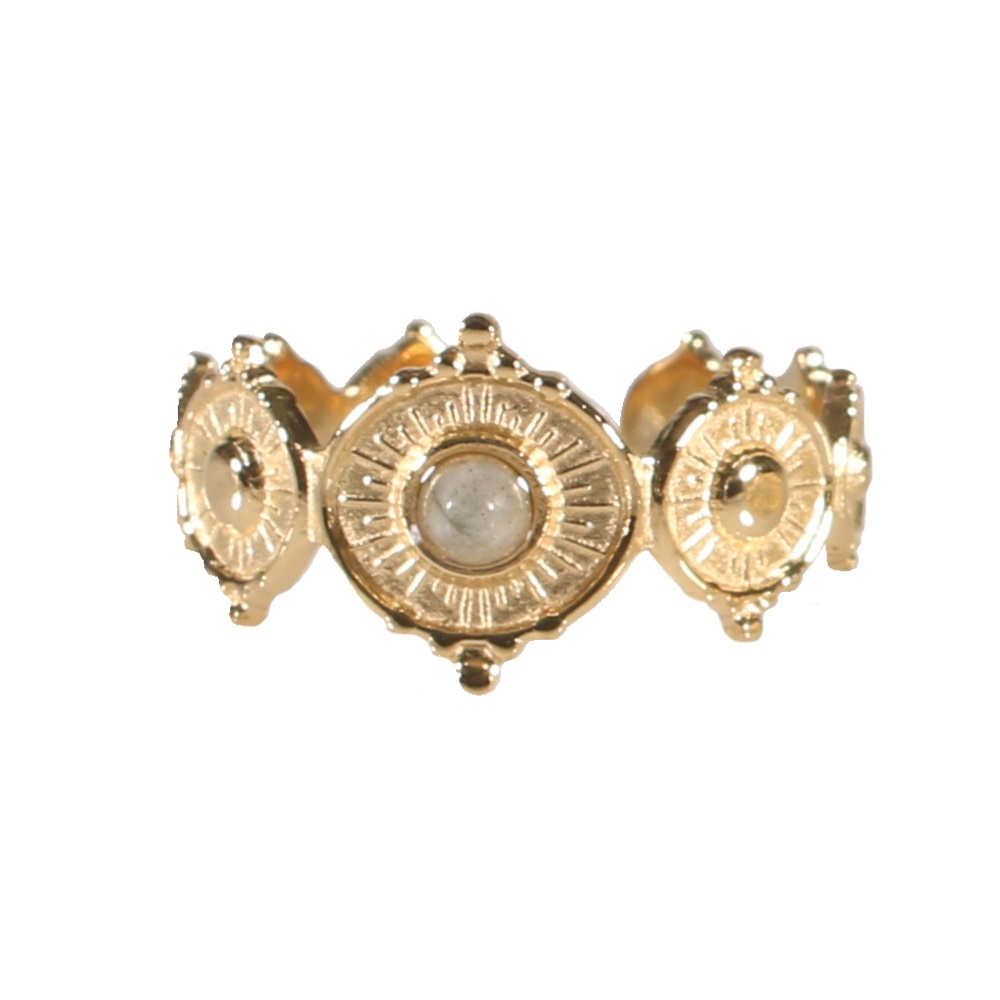 Bague composée de différents médaillons ronds avec motifs et contours en relief en acier doré serti d'une véritable pierre de jade blanc.