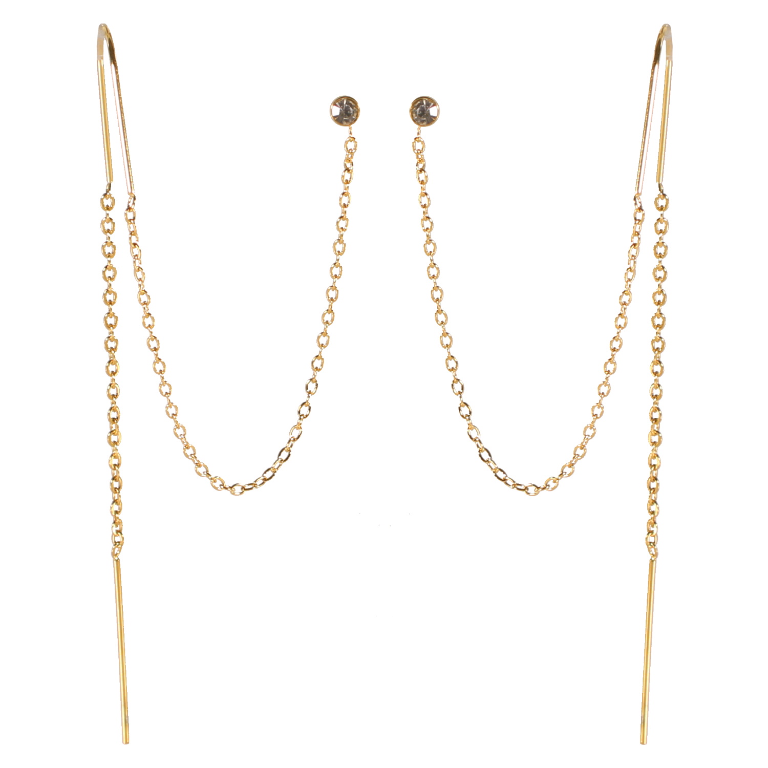 Description Boucles d'oreilles pendantes composées d'une chaîne en acier doré et d'une puce piercing tragus/cartilage sertie d'un cristal.