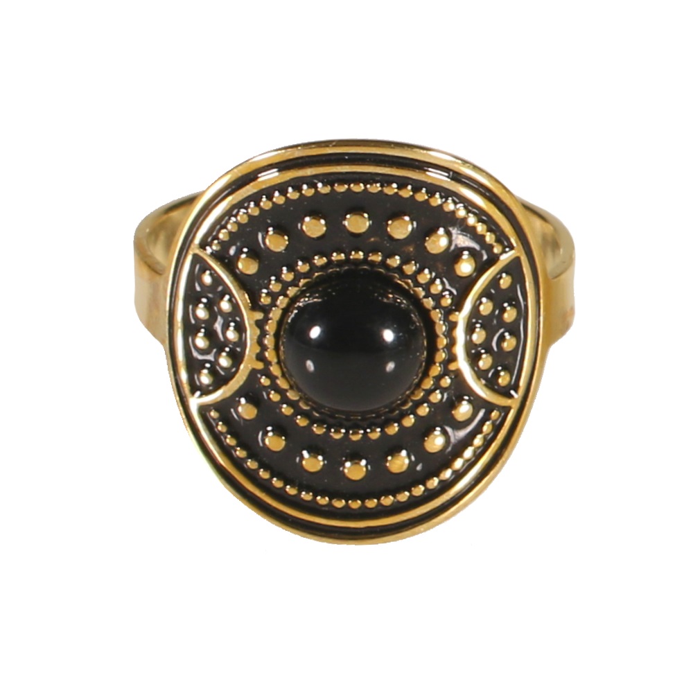 Description Bague de forme ronde aux motifs en relief en acier doré et émail de couleur noire surmontée d'une pierre sertie clos de couleur noire. Taille ajustable. Largeur 18 mm Matière(s) Acier , Rocaille . L'acier utilisé dans la bijouterie existe sous plusieurs qualités. Nous utilisons principalement la qualité 316L, qualité qui est utilisée en chirurgie. Cet acier est donc inoxydable et reste très résistant. Couleur(s) dominante(s) Doré , Noir Public Adolescent , Adulte . Genre Femme , Fille . Saison Indémodable . Cliquez sur une matière, un thème, une couleur ou une collection pour voir tous les articles associés.