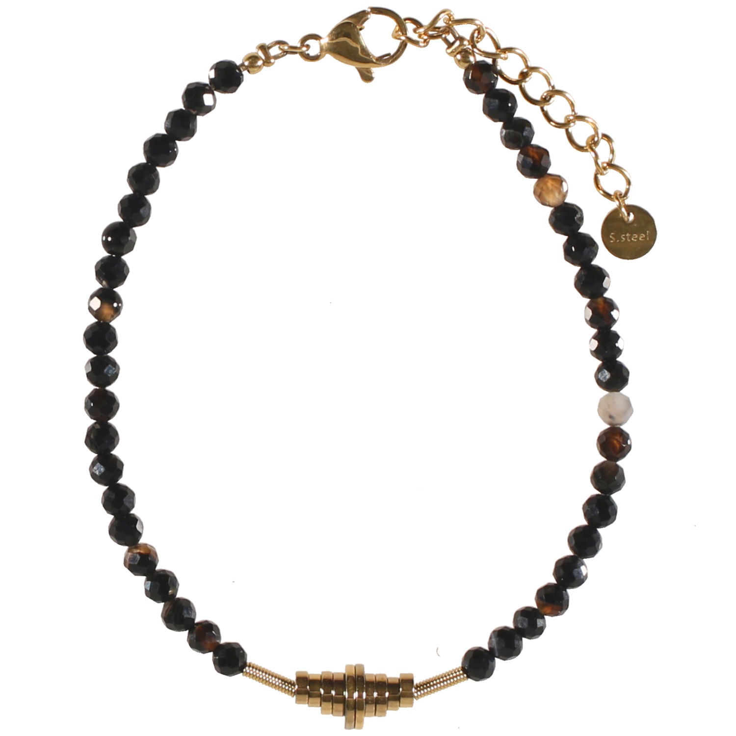 Bracelet avec rondelles cylindriques en acier doré et véritables perles en pierre d'agate.