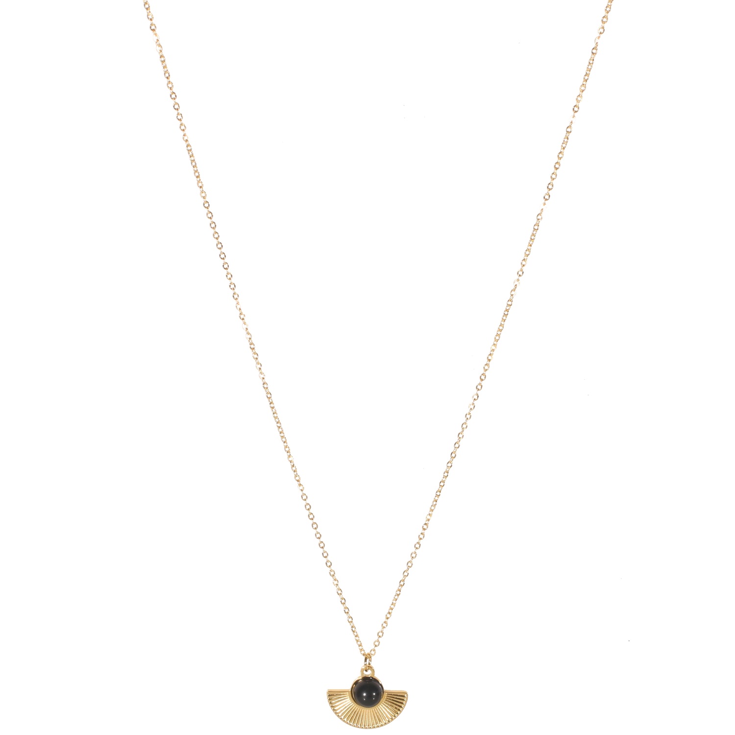 Description Collier composé d'une chaîne et d'un pendentif éventail en acier doré surmonté d'une pierre de couleur noire de forme ronde. Fermoir mousqueton avec rallonge de 7 cm. Cliquez sur une matière, un thème, une couleur ou une collection pour voir tous les articles associés.