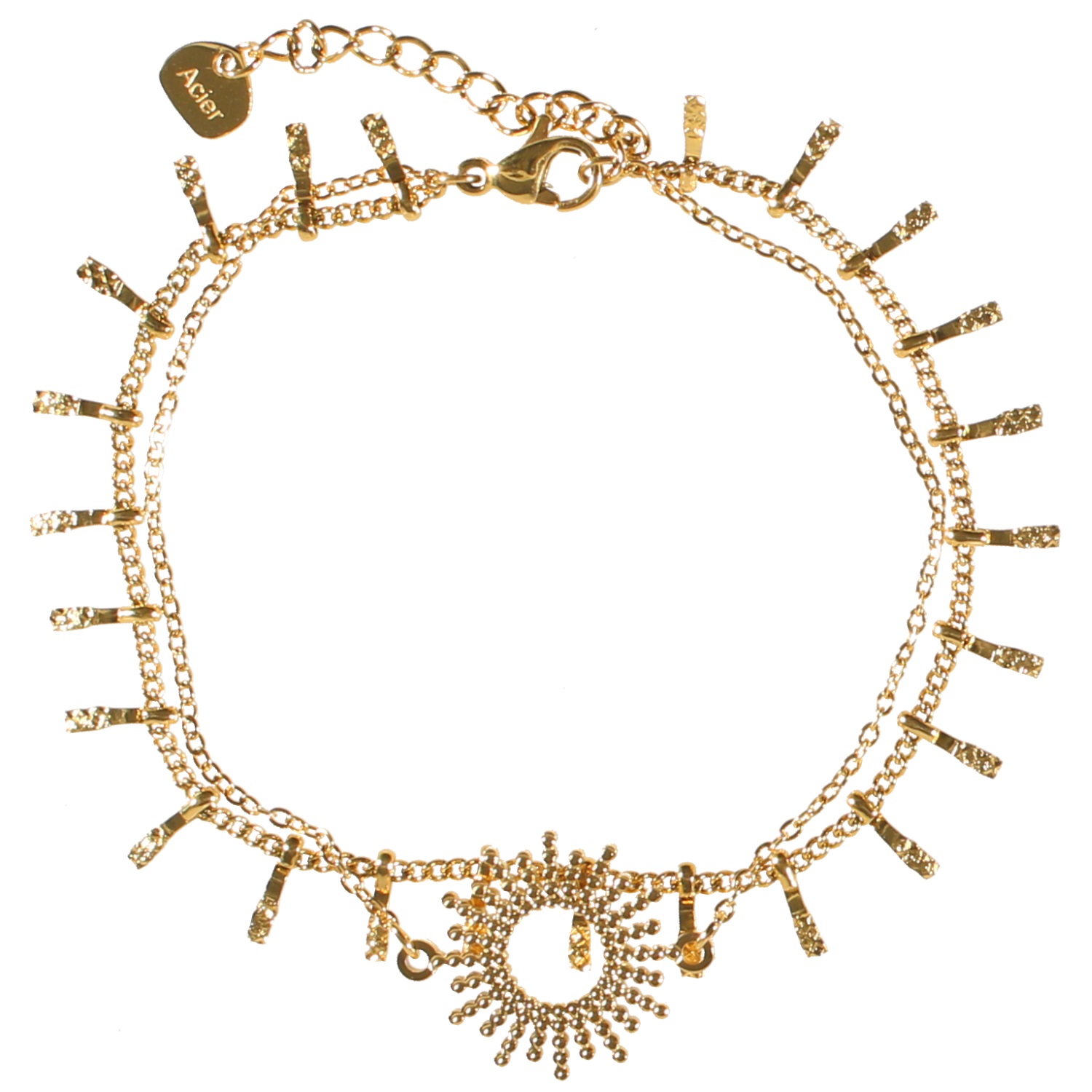 Description Bracelet double rangs composé d'une chaîne avec pampilles en acier doré et d'une chaîne avec soleil en acier doré. Fermoir mousqueton avec 3 cm de rallonge. Longueur 15+3 cm [Guide des tailles] Largeur 15 mm Matière(s) Acier . L'acier utilisé dans la bijouterie existe sous plusieurs qualités. Nous utilisons principalement la qualité 316L, qualité qui est utilisée en chirurgie. Cet acier est donc inoxydable et reste très résistant. Fermoir Mousqueton Couleur(s) dominante(s) Doré Public Adolescent , Adulte . Genre Femme , Fille . Saison Indémodable . Thème(s) Nature . Collection My Sun Cliquez sur une matière, un thème, une couleur ou une collection pour voir tous les articles associés.
