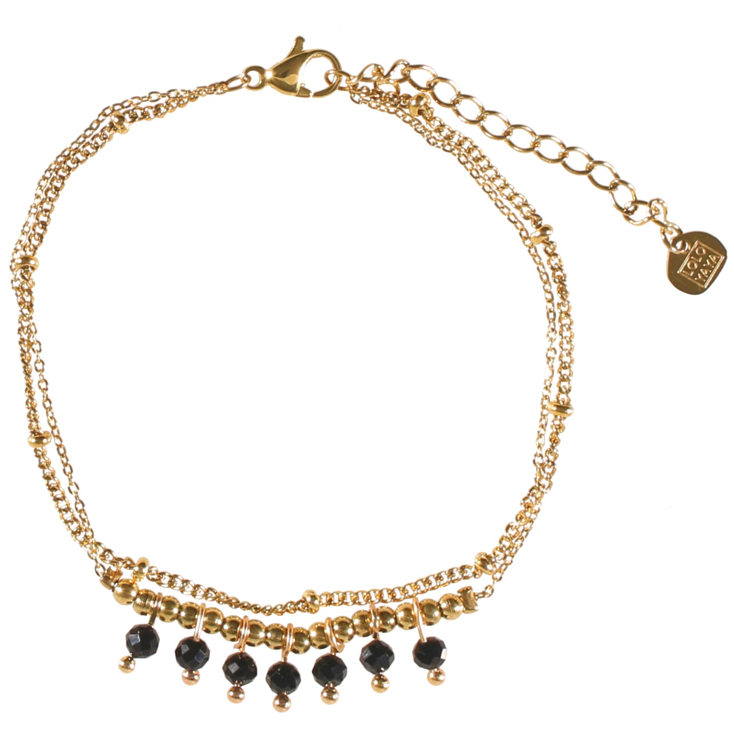 Bracelet double rangs composé d'une chaîne en acier doré et d'une chaîne avec perles en acier doré et perles pendantes en véritable pierre d'agate noire.
