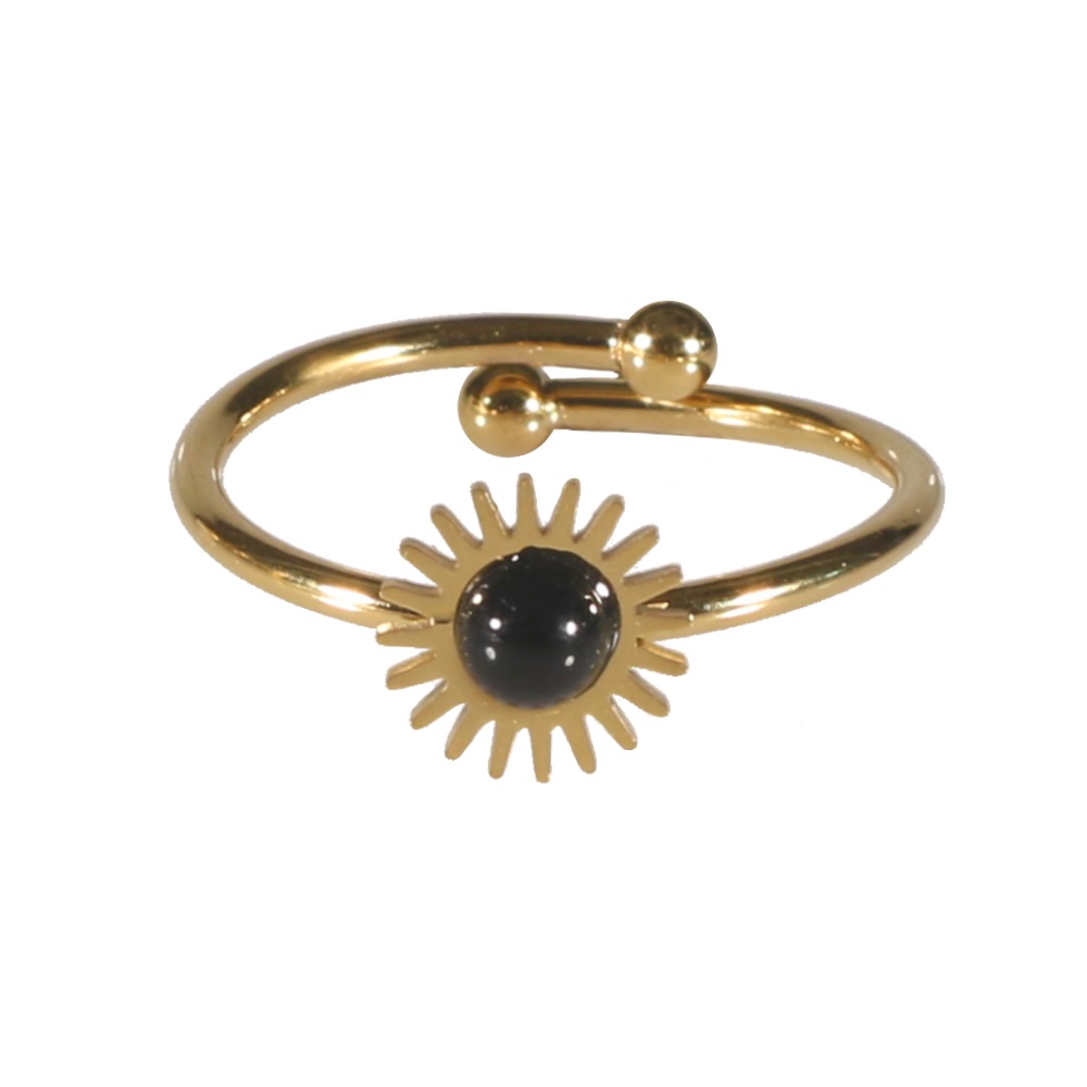 Bague avec pastille ronde au contour de rayons de soleil en acier doré surmontée d'une véritable pierre d'agate noire.