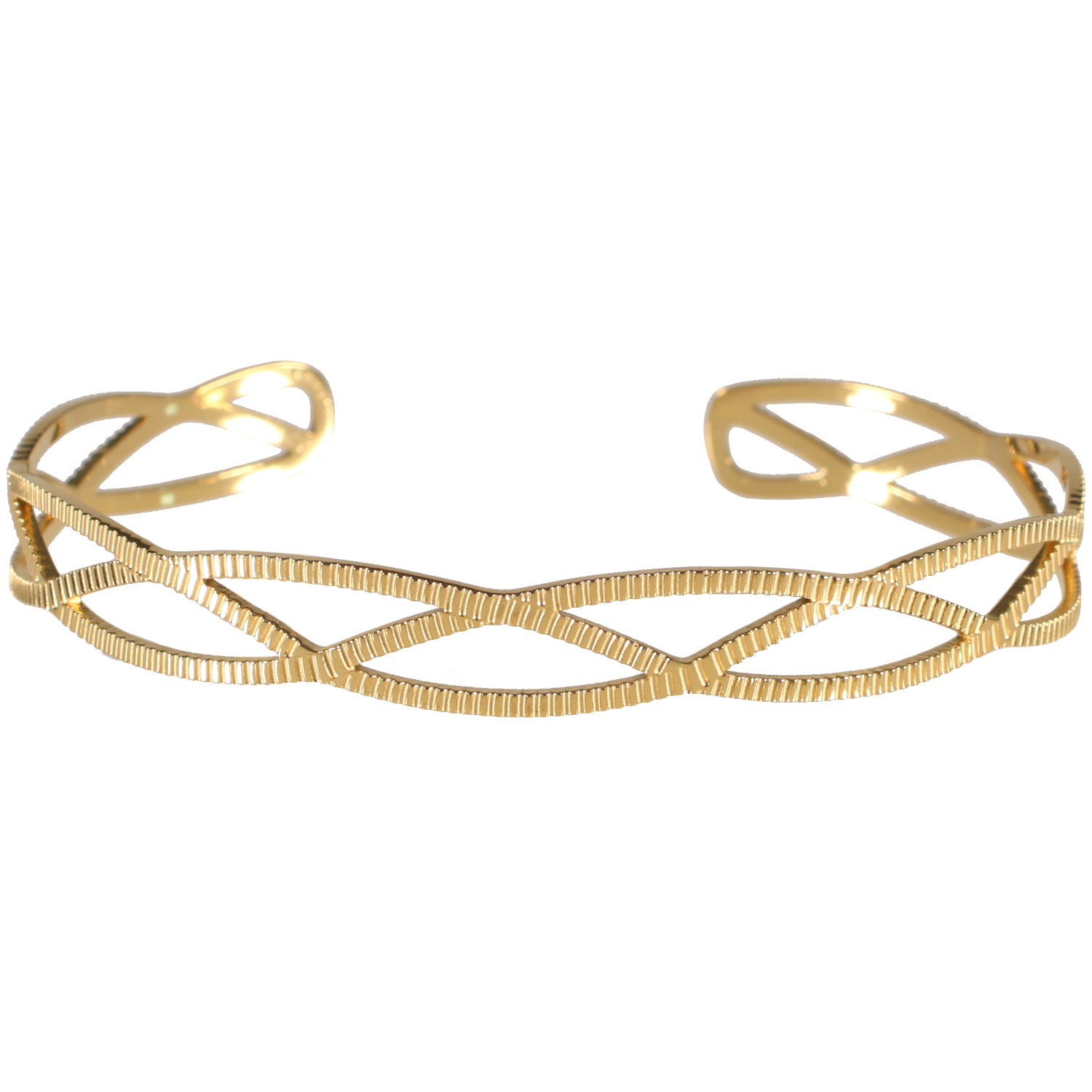 Description Bracelet jonc rigide au motif de trois rangs entrelacés en acier doré. Largeur 8 mm Diamètre 60 mm [Guide des tailles] Matière(s) Acier . L'acier utilisé dans la bijouterie existe sous plusieurs qualités. Nous utilisons principalement la qualité 316L, qualité qui est utilisée en chirurgie. Cet acier est donc inoxydable et reste très résistant. Fermoir Aucun Couleur(s) dominante(s) Doré Public Adolescent , Adulte . Genre Femme , Fille . Saison Indémodable . Collection Fashion metal Cliquez sur une matière, un thème, une couleur ou une collection pour voir tous les articles associés.