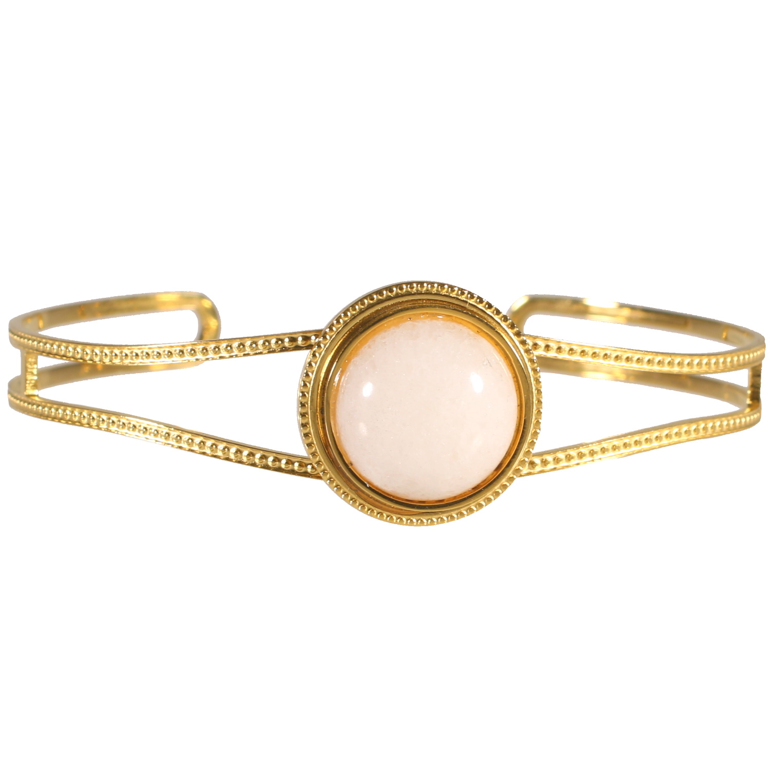 Bracelet jonc ouvert double rangs en acier doré surmonté d'une pastille bombée en céramique de couleur blanche de forme ronde.