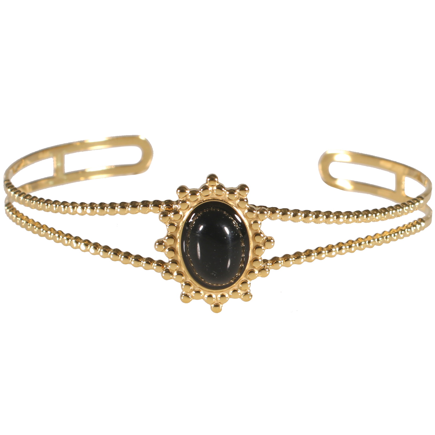 Bracelet jonc ouvert double rangs avec pastille ovale aux contours en relief en acier doré surmontée d'une véritable pierre d'agate noire de forme ovale.