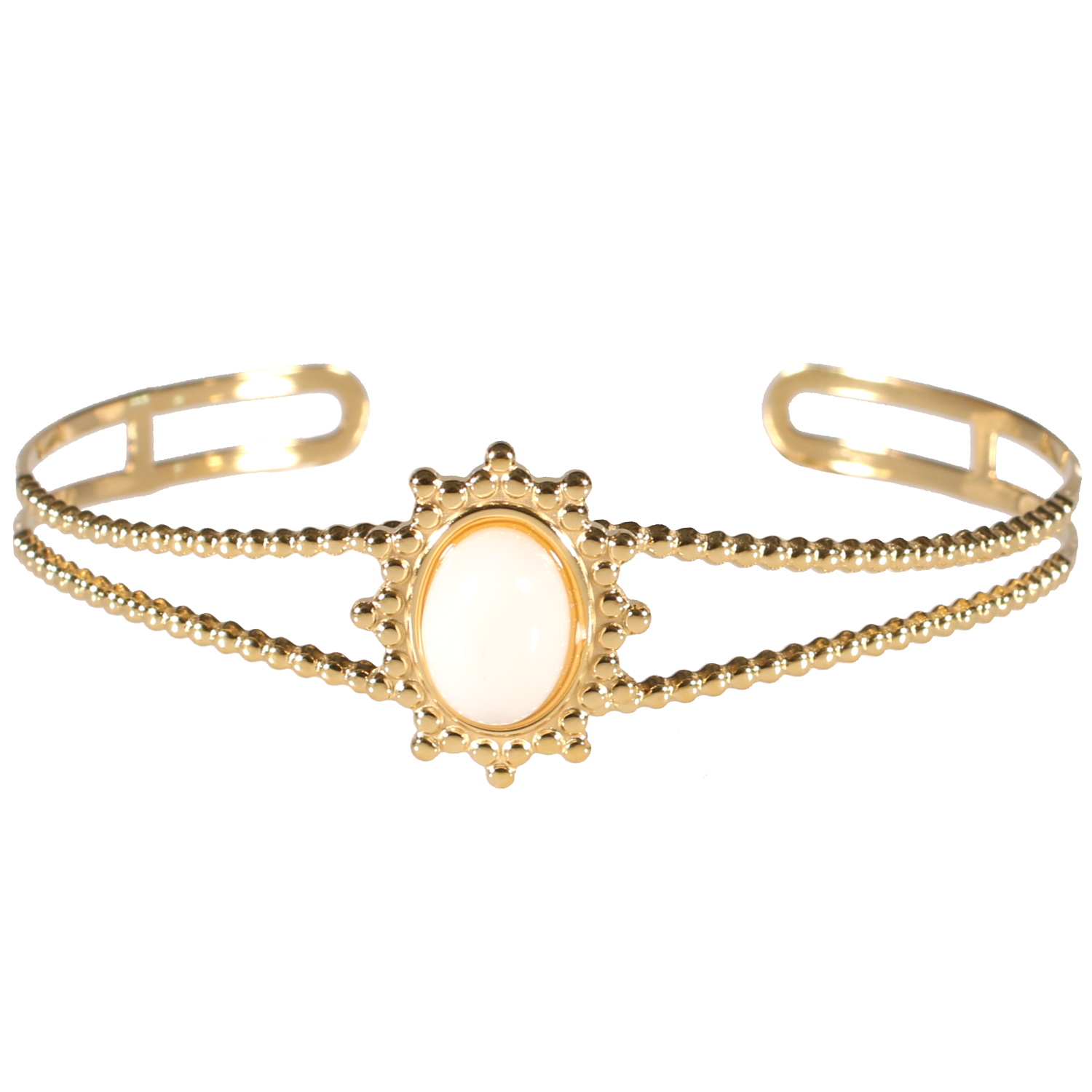 Bracelet jonc ouvert double rangs avec pastille ovale aux contours en relief en acier doré surmontée d'une pastille bombée en céramique de couleur blanche de forme ovale.