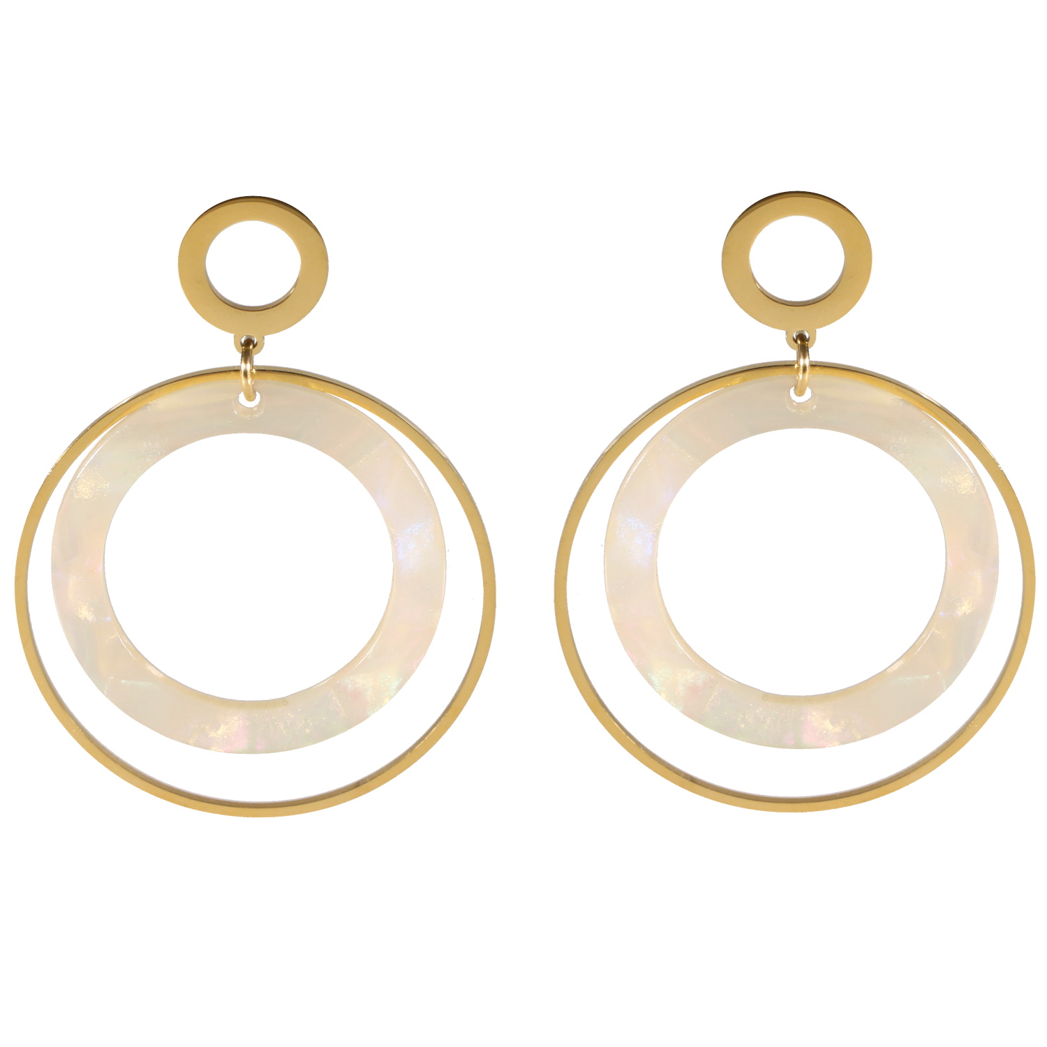 Description Boucles d'oreilles pendantes composées de deux cercles en acier doré et d'un cercle d'imitation de nacre. Largeur 45 mm Hauteur 60 mm Matière(s) Acier , Plastique . L'acier utilisé dans la bijouterie existe sous plusieurs qualités. Nous utilisons principalement la qualité 316L, qualité qui est utilisée en chirurgie. Cet acier est donc inoxydable et reste très résistant. Fermoir Tiges poussettes Couleur(s) dominante(s) Blanc , Doré Public Adolescent , Adulte . Genre Femme , Fille . Saison Indémodable . Collection Doux coton Cliquez sur une matière, un thème, une couleur ou une collection pour voir tous les articles associés.
