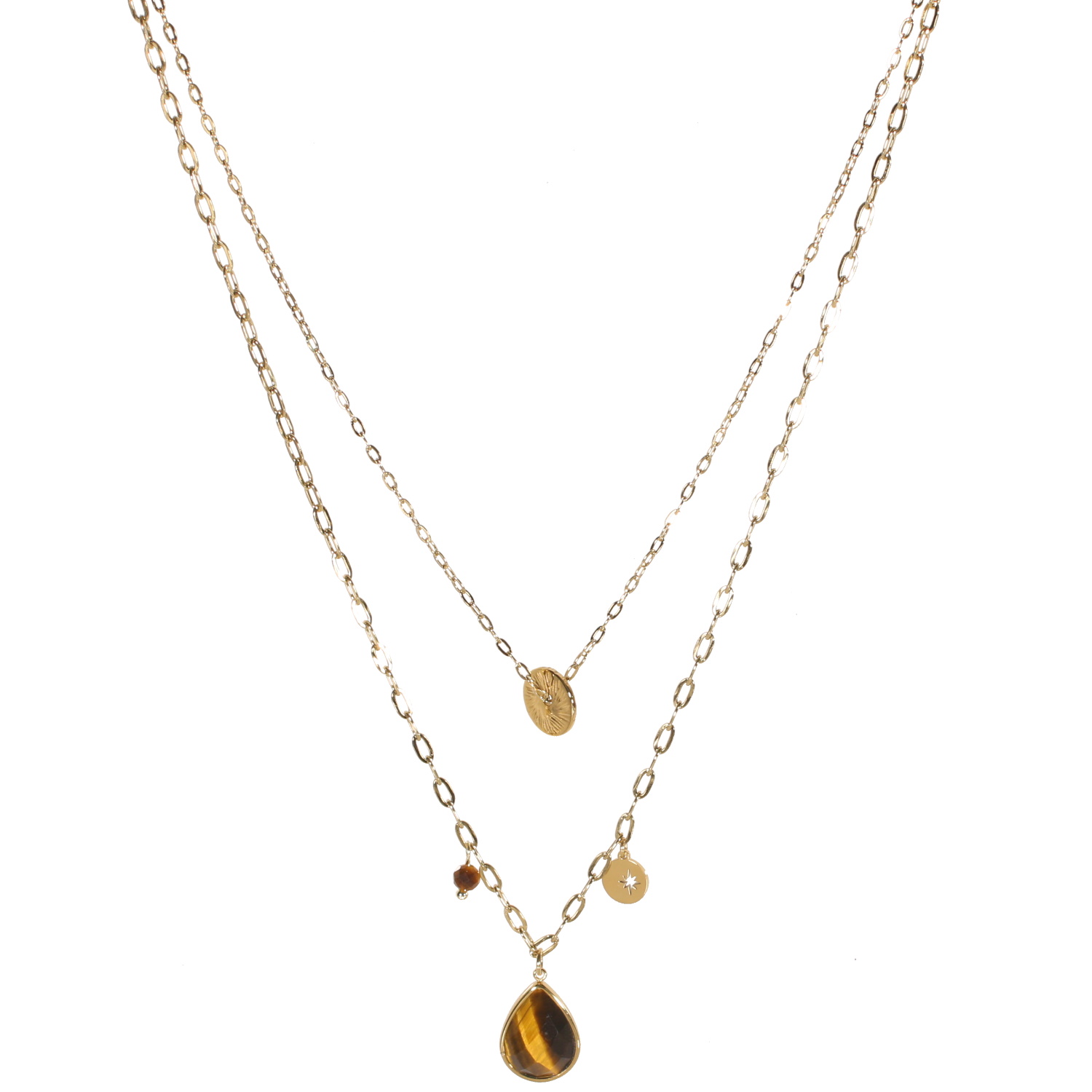 Collier double rangs composé d'un collier de 39 cm de long avec rondelle ronde en acier doré, ainsi qu'un collier de 45 cm de long avec pastille ronde et une étoile ajourée en acier doré et une perle de œil de tigre et une pierre véritable de œil de tigre serti clos en forme de goutte.<br/>Fermoir mousqueton avec 4 cm de rallonge.<br/>L'œil de tigre est une variété de quartz.