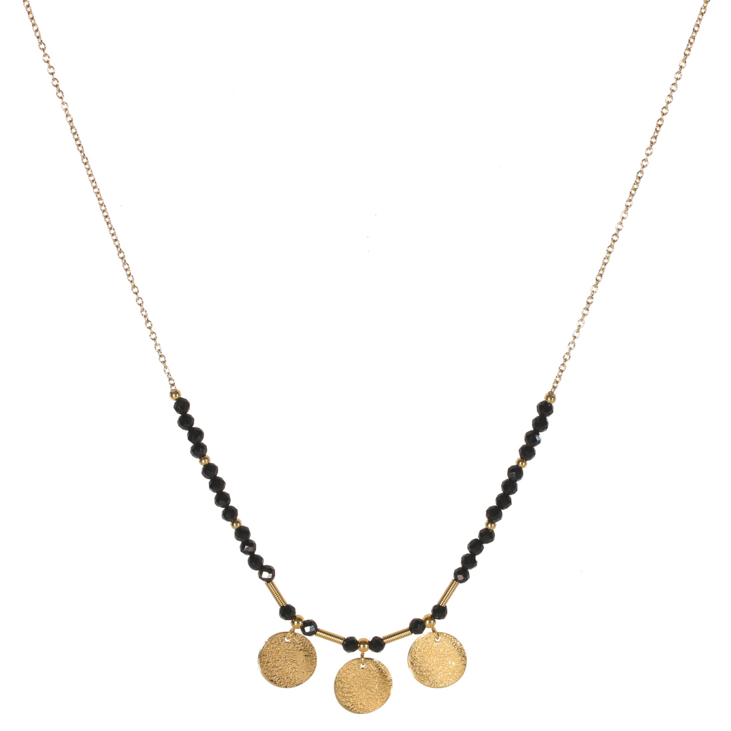 Collier composé d'une chaîne et de trois pampilles rondes en acier doré et de perles en en véritable pierre d'agate noire.
