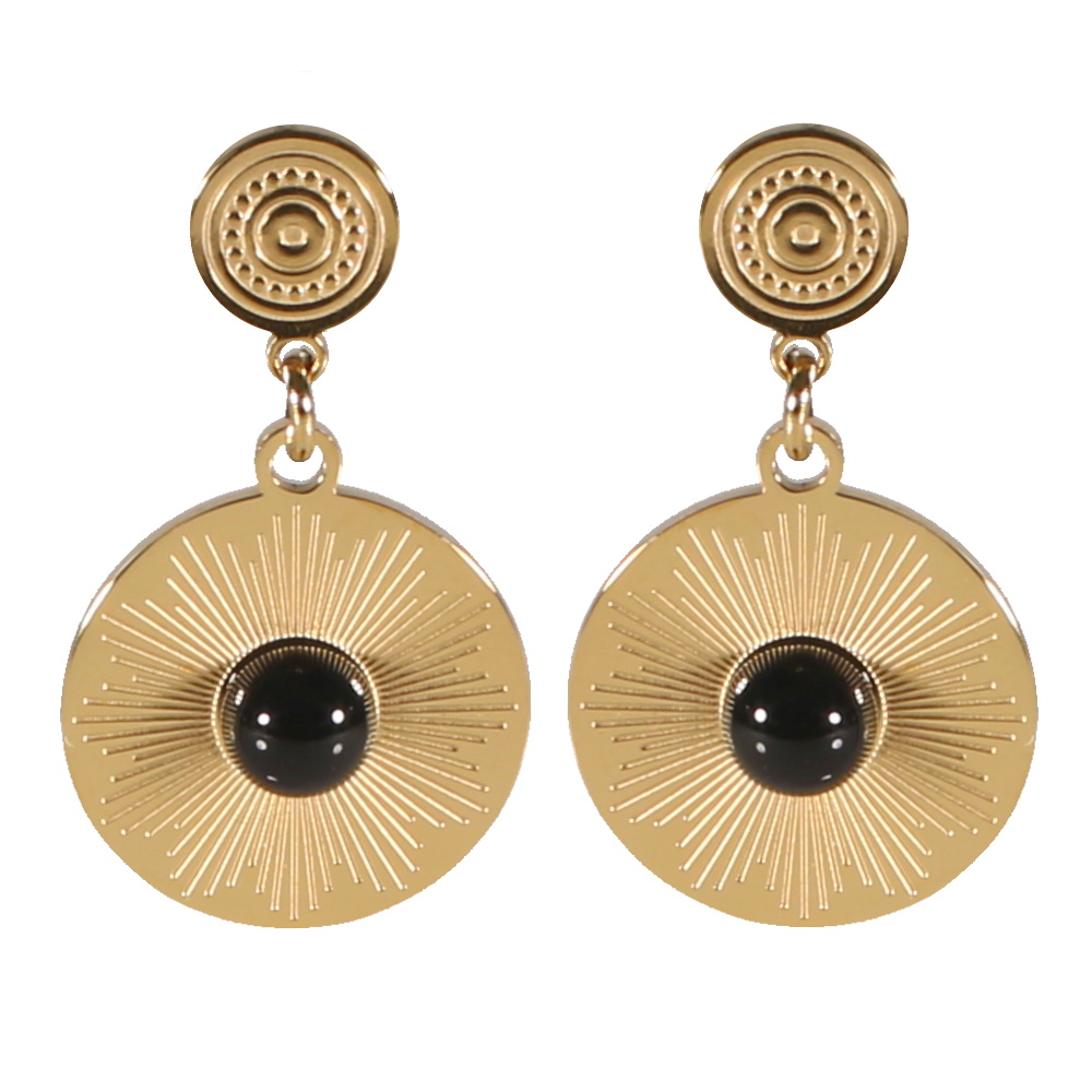 Boucles d'oreilles pendantes composées d'une puce aux motifs en relief et d'une pastille avec motifs de rayons en acier doré surmontée d'une véritable pierre d'agate noire.