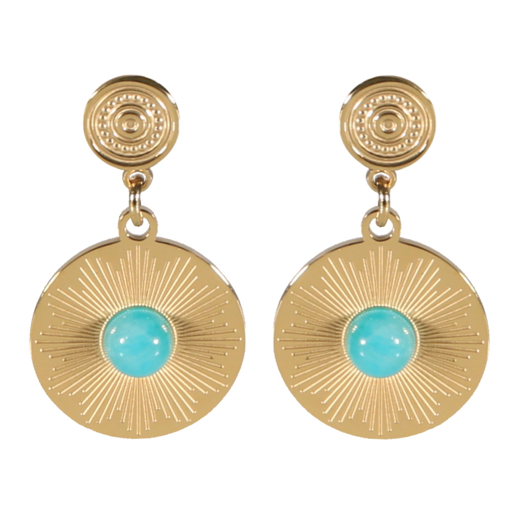 Boucles d'oreilles pendantes composées d'une puce aux motifs en relief et d'une pastille avec motifs de rayons en acier doré surmontée d'une véritable pierre d'amazonite.<br/>L'amazonite aide aux discours et à la communication. Elles est bénéfique contre les dépressions, donne force et dynamisme.<br/>Elle aide à lutter contre les pensées  Pendantes Rond  Adolescent Adulte Femme Fille Indémodable