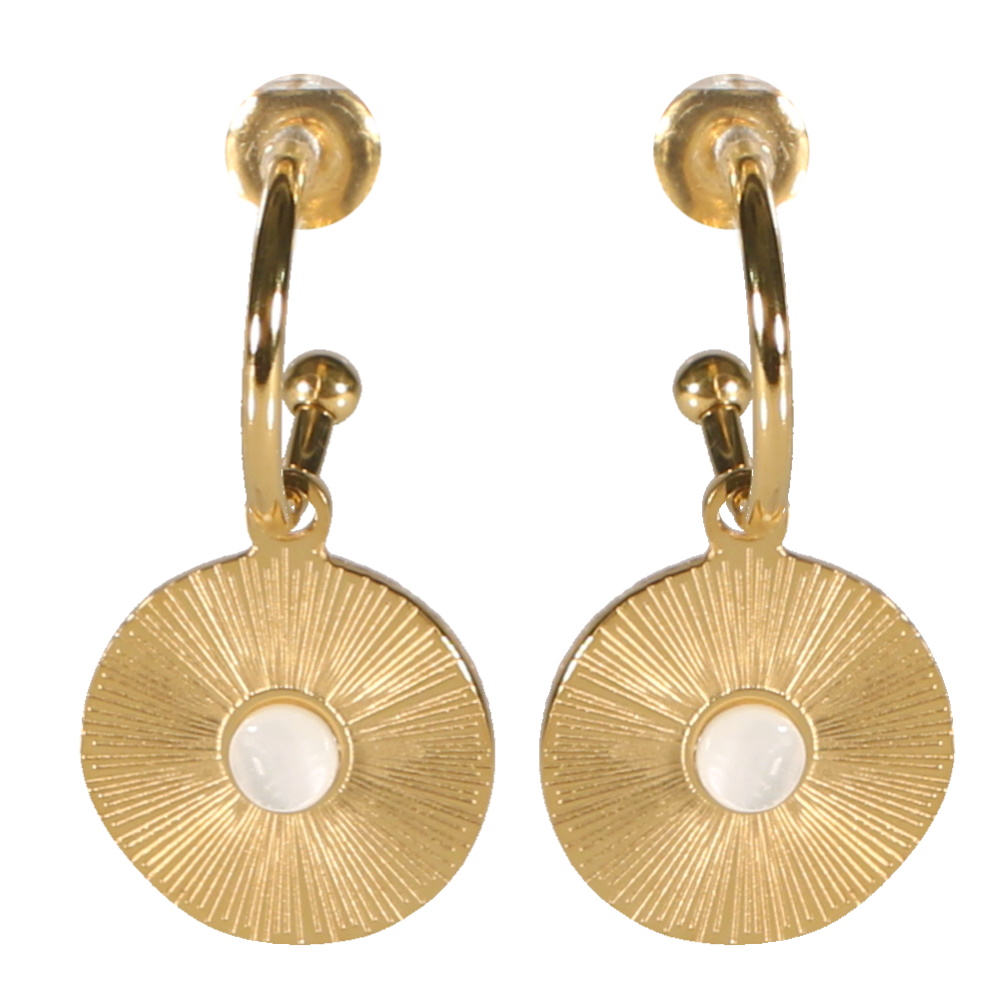 Boucles d'oreilles créoles composées d'une pastille avec motifs de rayons en acier doré surmontée d'une coquille de nacre.