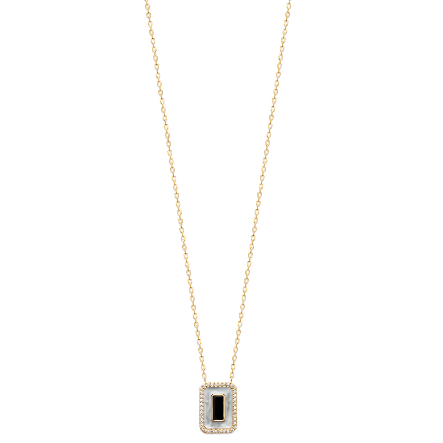 Collier composé d'une chaîne en plaqué or jaune 18 carats et d'un pendentif rectangulaire pavé pour le contour d'oxydes de zirconium blancs et au centre de nacre surmonté d'une véritable pierre d'agate noire sertie clos.