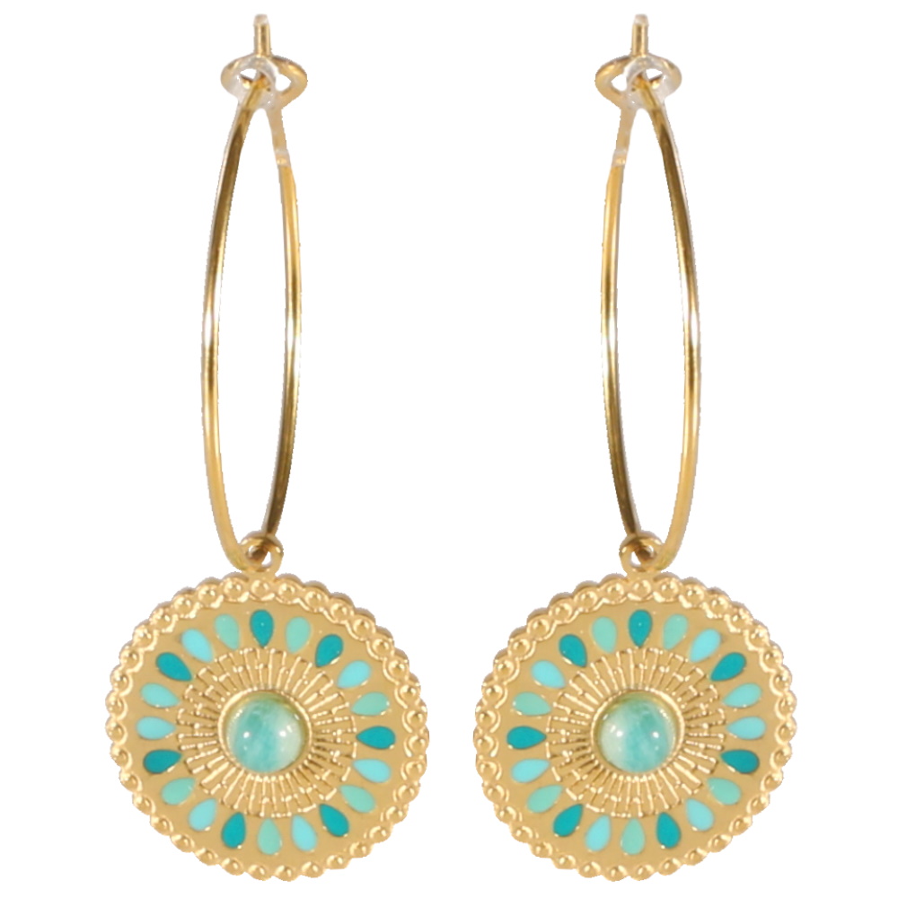 Boucles d'oreilles créoles en acier doré avec pastille pendantes rondes aux motifs en émail de couleur verte et surmontée d'une pierre de couleur verte.