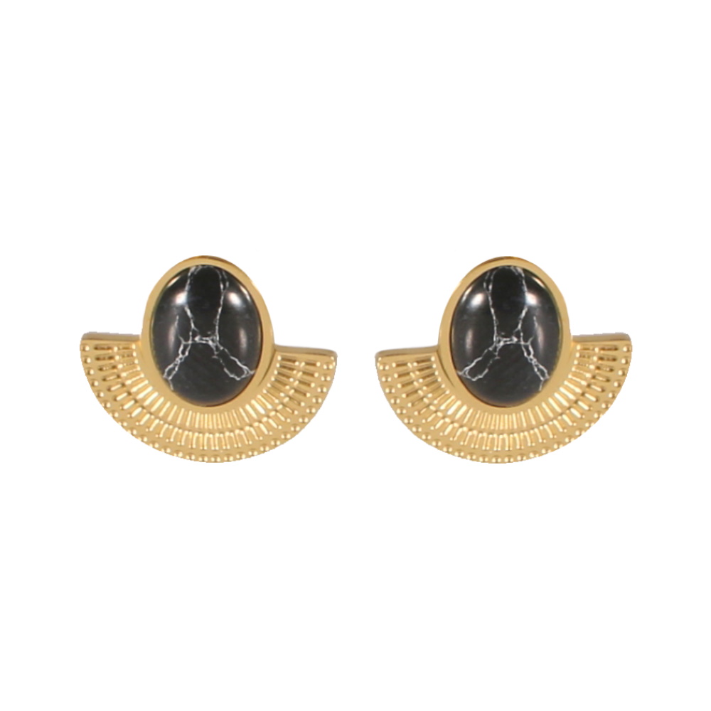 Description Boucles d'oreilles composées d'un demi rond avec motifs en acier doré surmonté d'une pierre de couleur noire sertie clos de forme ovale. Largeur 14 mm Hauteur 12 mm Matière(s) Acier , Rocaille . L'acier utilisé dans la bijouterie existe sous plusieurs qualités. Nous utilisons principalement la qualité 316L, qualité qui est utilisée en chirurgie. Cet acier est donc inoxydable et reste très résistant. Fermoir Tiges poussettes Couleur(s) dominante(s) Doré , Noir Public Adolescent , Adulte . Genre Femme , Fille . Saison Indémodable . Cliquez sur une matière, un thème, une couleur ou une collection pour voir tous les articles associés.