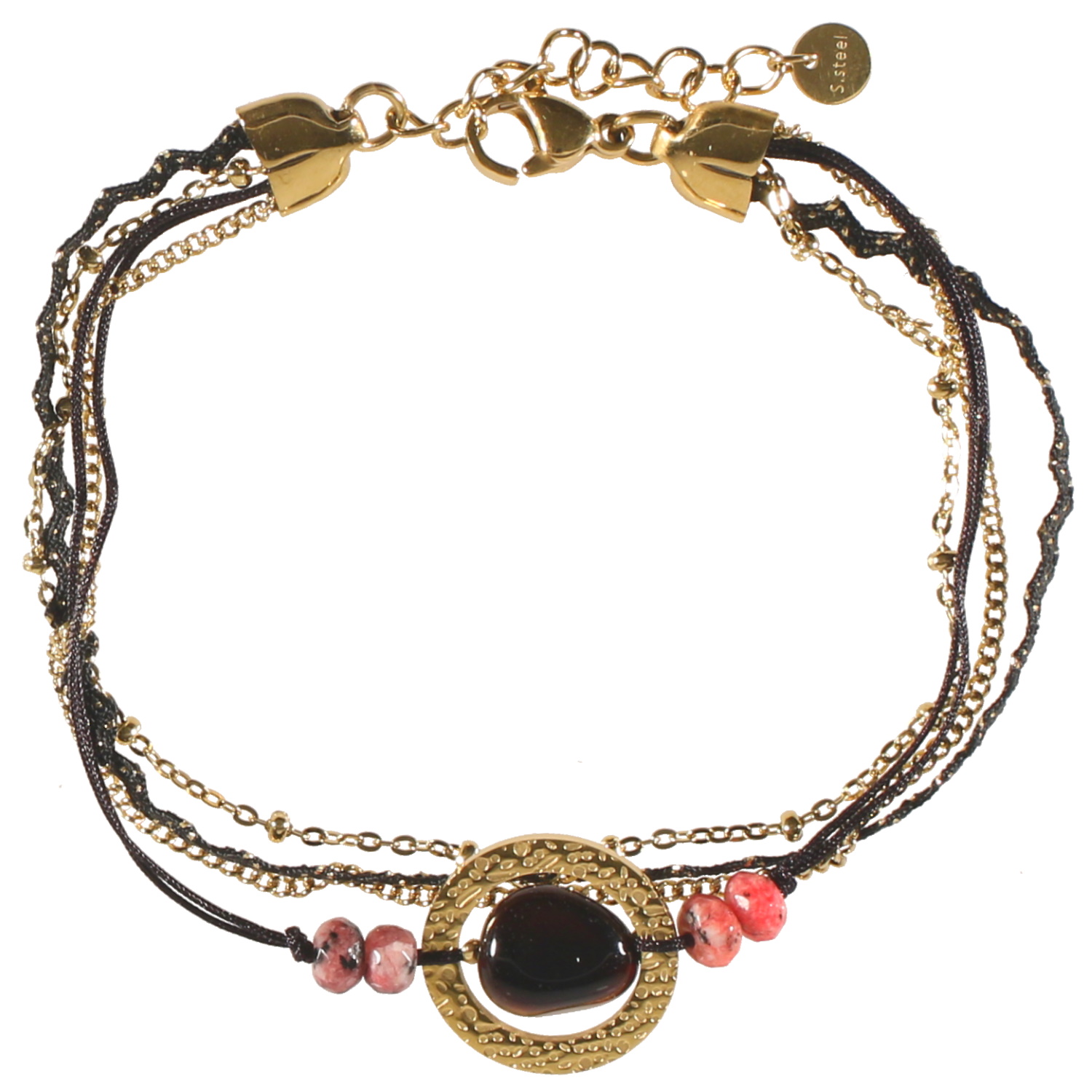 Bracelet quatre rangs composé de deux chaînes en acier doré, un cordon de textile noire en zigzag, ainsi que deux cordons de couleur noire avec cercle en acier doré, perles de couleur et une véritable pierre d'agate noire.