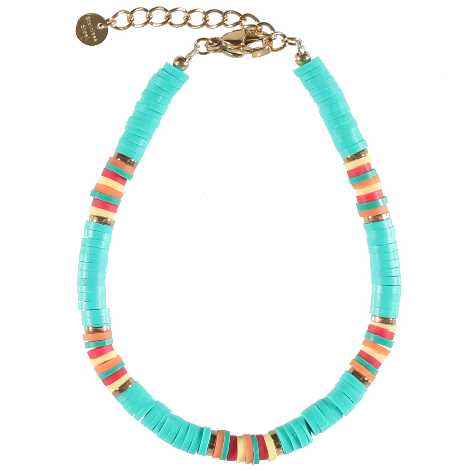 Description Bracelet composé de perles cylindriques heishi en résine synthétique et caoutchouc de couleur. Fermoir mousqueton en acier doré avec une rallonge de 3 cm. Cliquez sur une matière, un thème, une couleur ou une collection pour voir tous les articles associés.