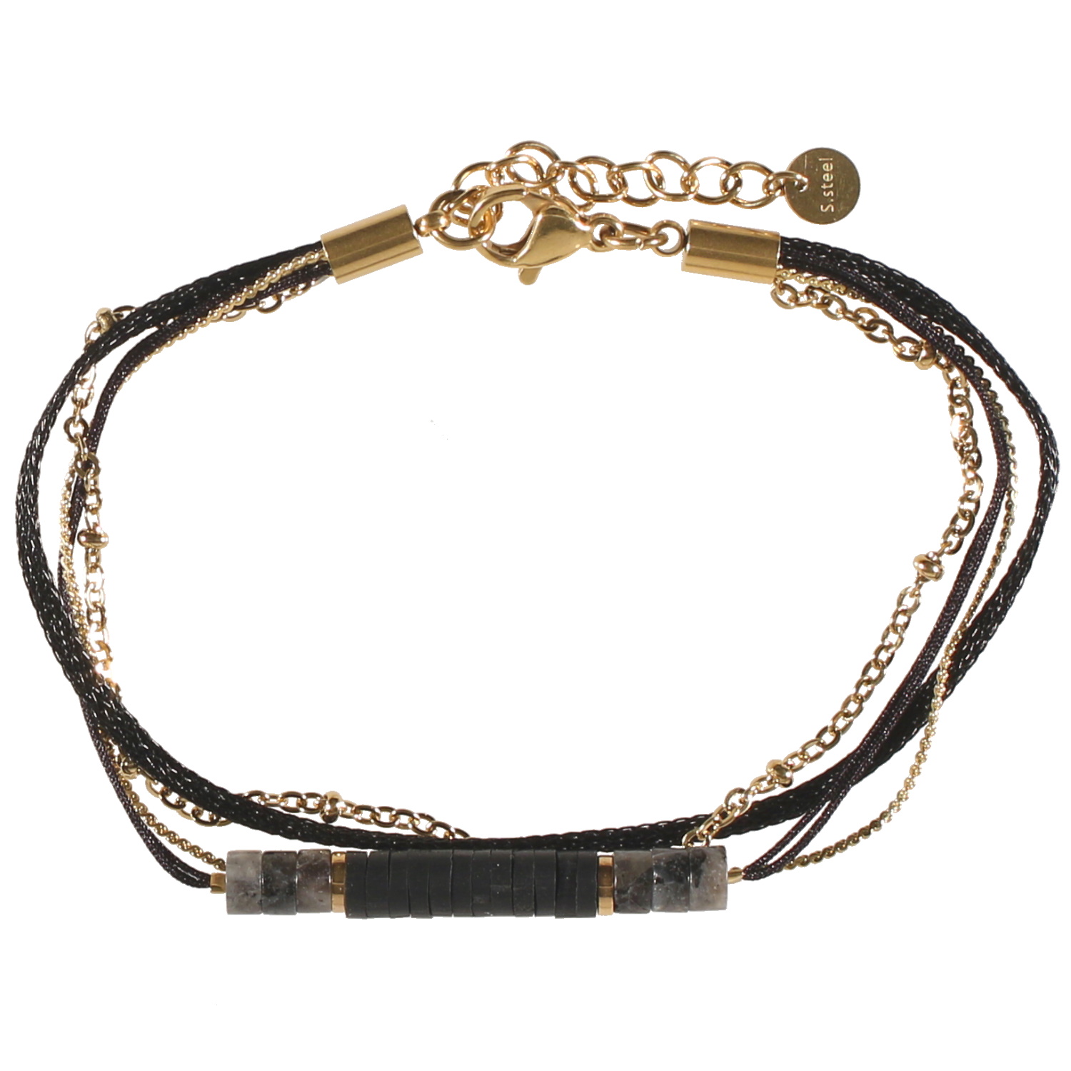 Bracelet quatre rangs composé de deux chaînes en acier doré, un cordon de textile noire et un cordon de coton avec perles cylindriques en caoutchouc et en pierre naturelle.