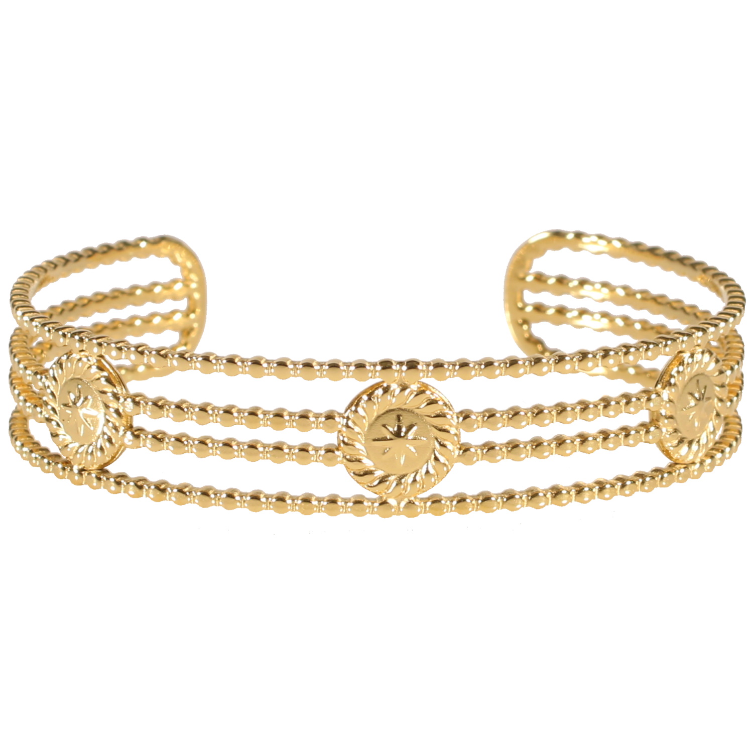 Description Bracelet jonc rigide quatre rangs avec motifs d'étoiles en acier doré. Cliquez sur une matière, un thème, une couleur ou une collection pour voir tous les articles associés.