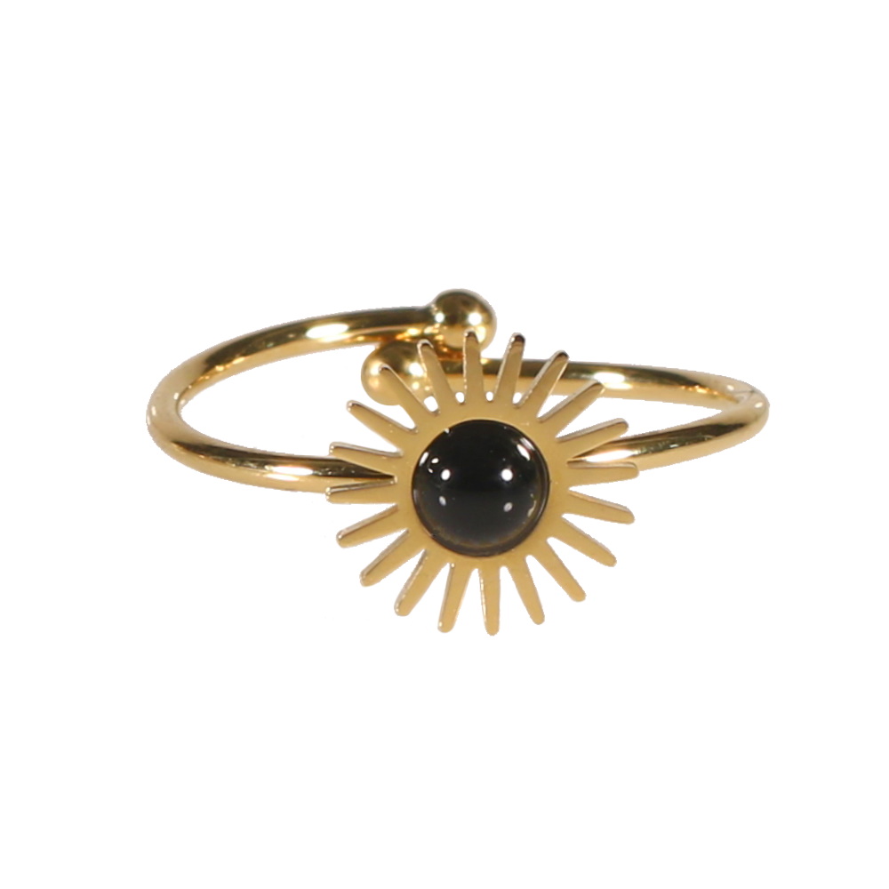 Bague surmontée d'un soleil en acier doré serti clos d'une véritable pierre d'agate noire de forme ronde.