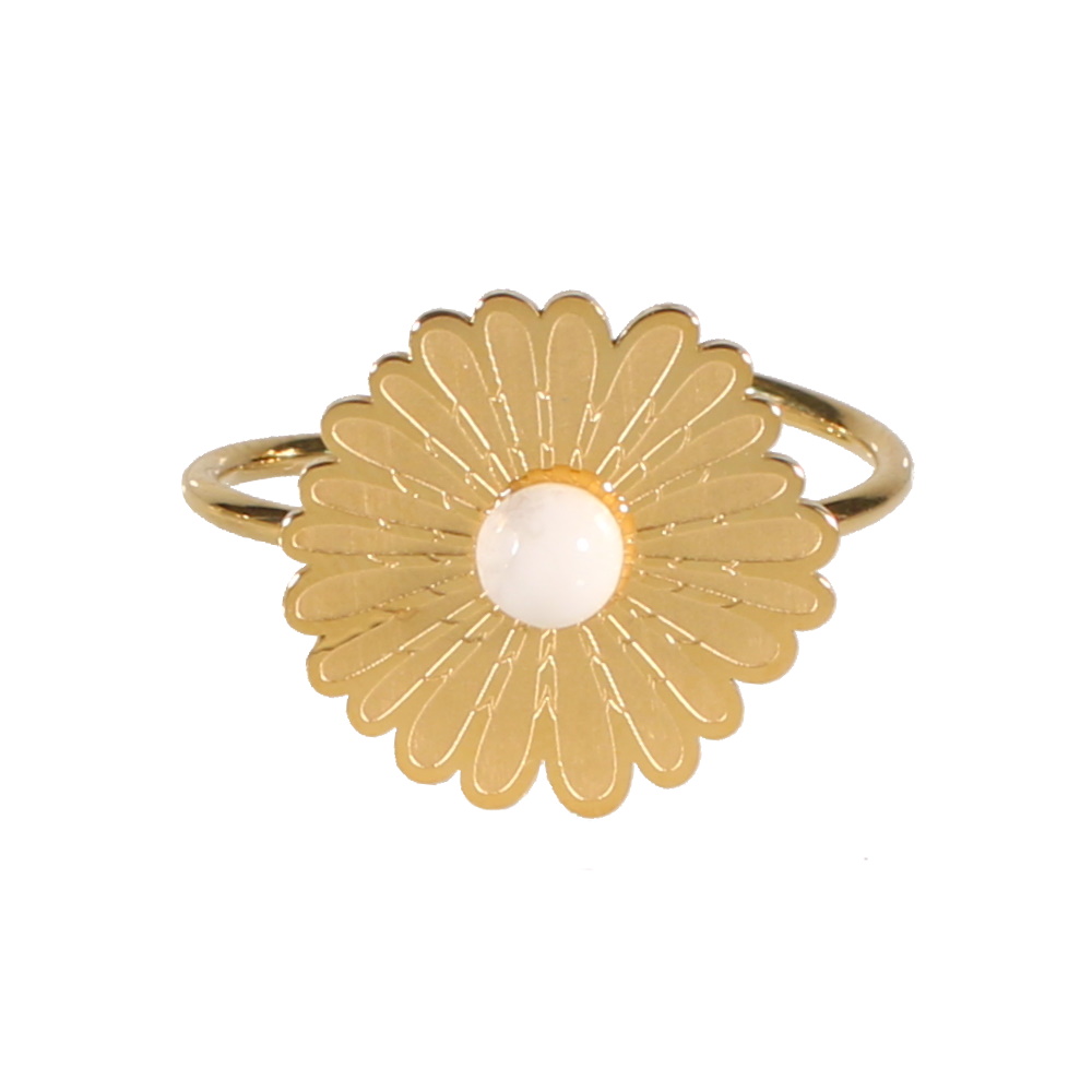 Bague surmontée d'une fleur en acier doré serti clos d'une véritable pierre de Howlite de forme ronde.