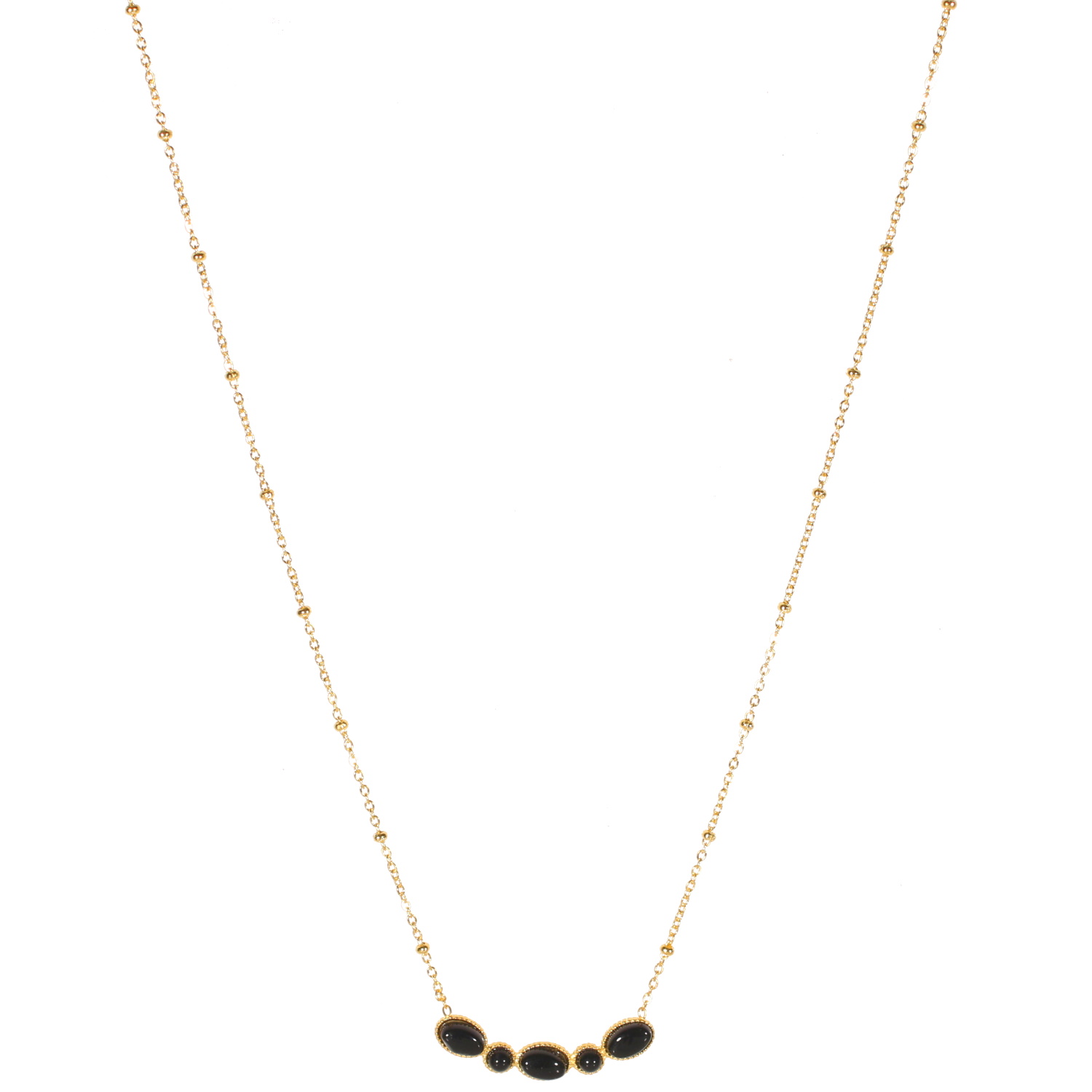 Collier composé d'une chaîne en acier doré et d'une série de cinq pierres de couleur noire serties clos de forme ronde et ovale.