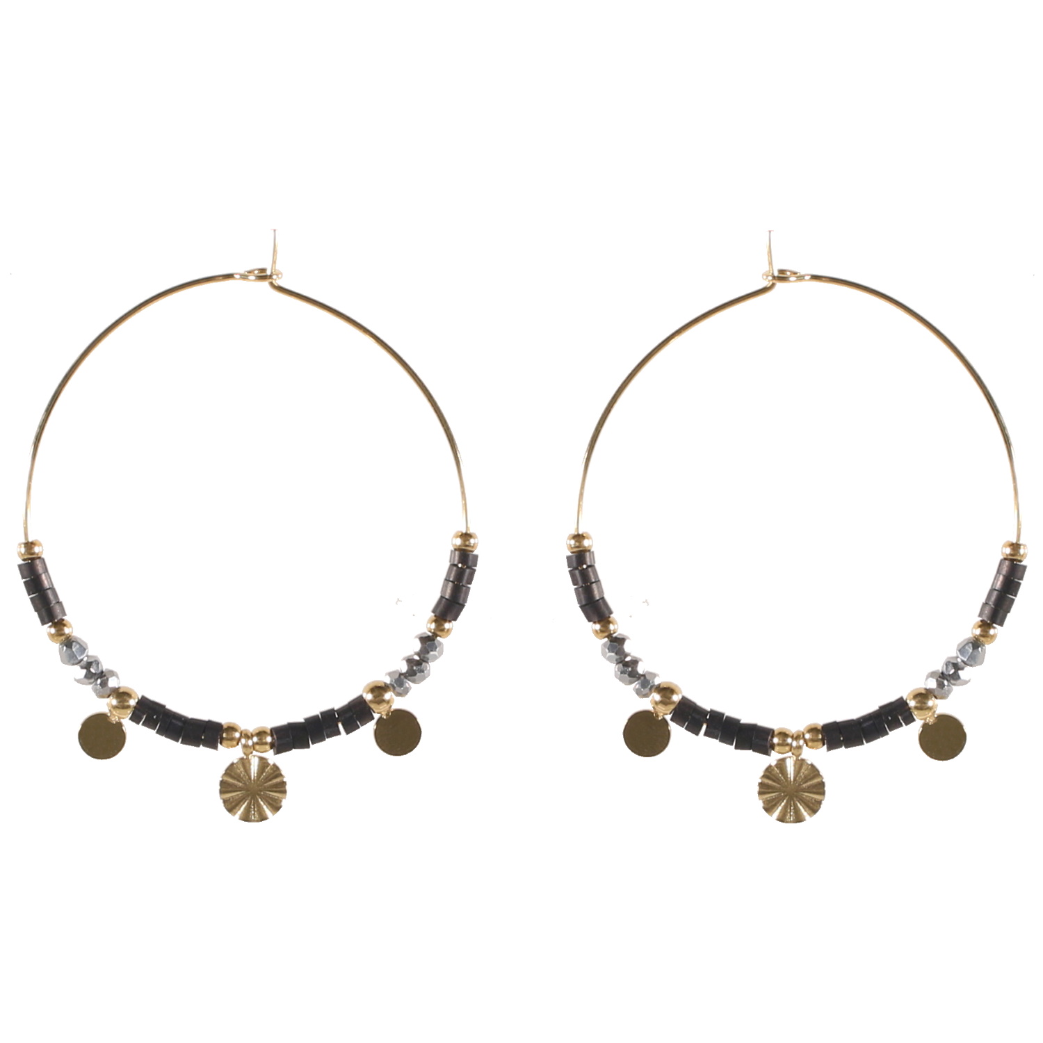 Boucles d'oreilles créoles avec pampilles rondes en acier doré surmontées de perles cylindriques en matière synthétique et perles de couleur. Créoles Perle Rond  Adolescent Adulte Femme Fille Indémodable