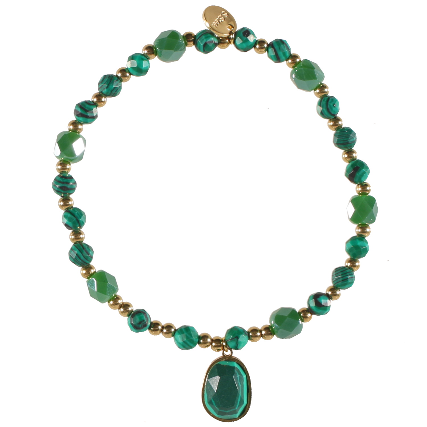 Bracelet fantaisie élastique composé de perles en acier doré, perles de couleur verte et d'imitation malachite et un pendant serti d'une pierre d'imitation malachite.