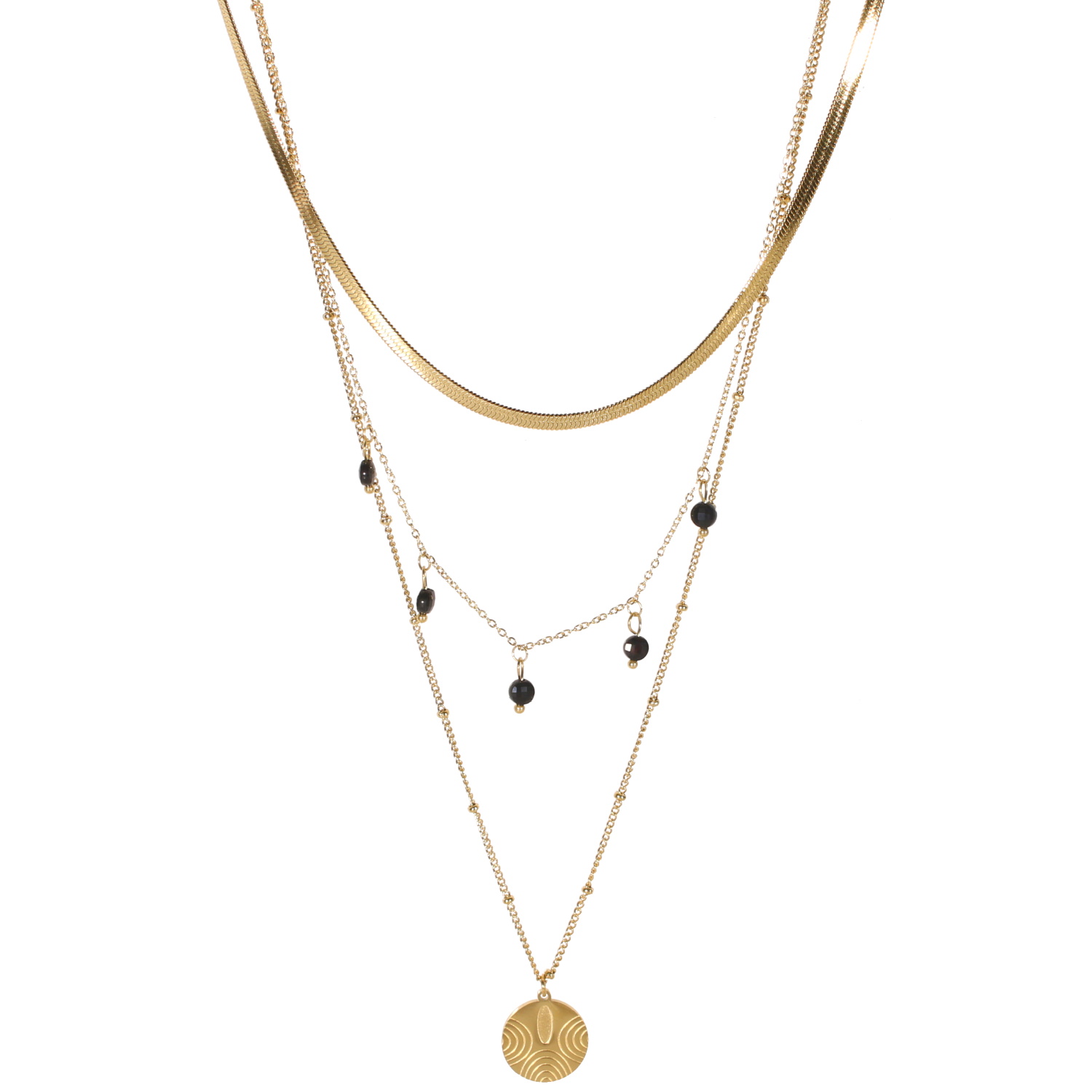 Collier triple rangs composé d'une chaîne maille serpent de 40 cm de long en acier doré, une chaîne de 45 cm de long en acier doré et perles en véritable pierre d'agate noire, ainsi qu'une chaîne de 54 cm de long avec pendentif rond avec motifs en acier doré.