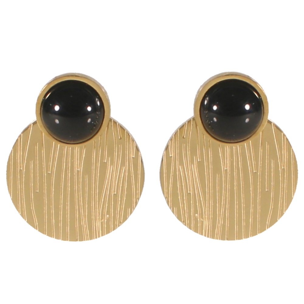 Boucles d'oreilles pendantes composées d'une puce en acier doré sertie d'une véritable pierre d'agate noire et d'une pastille ronde avec rayures en acier doré.