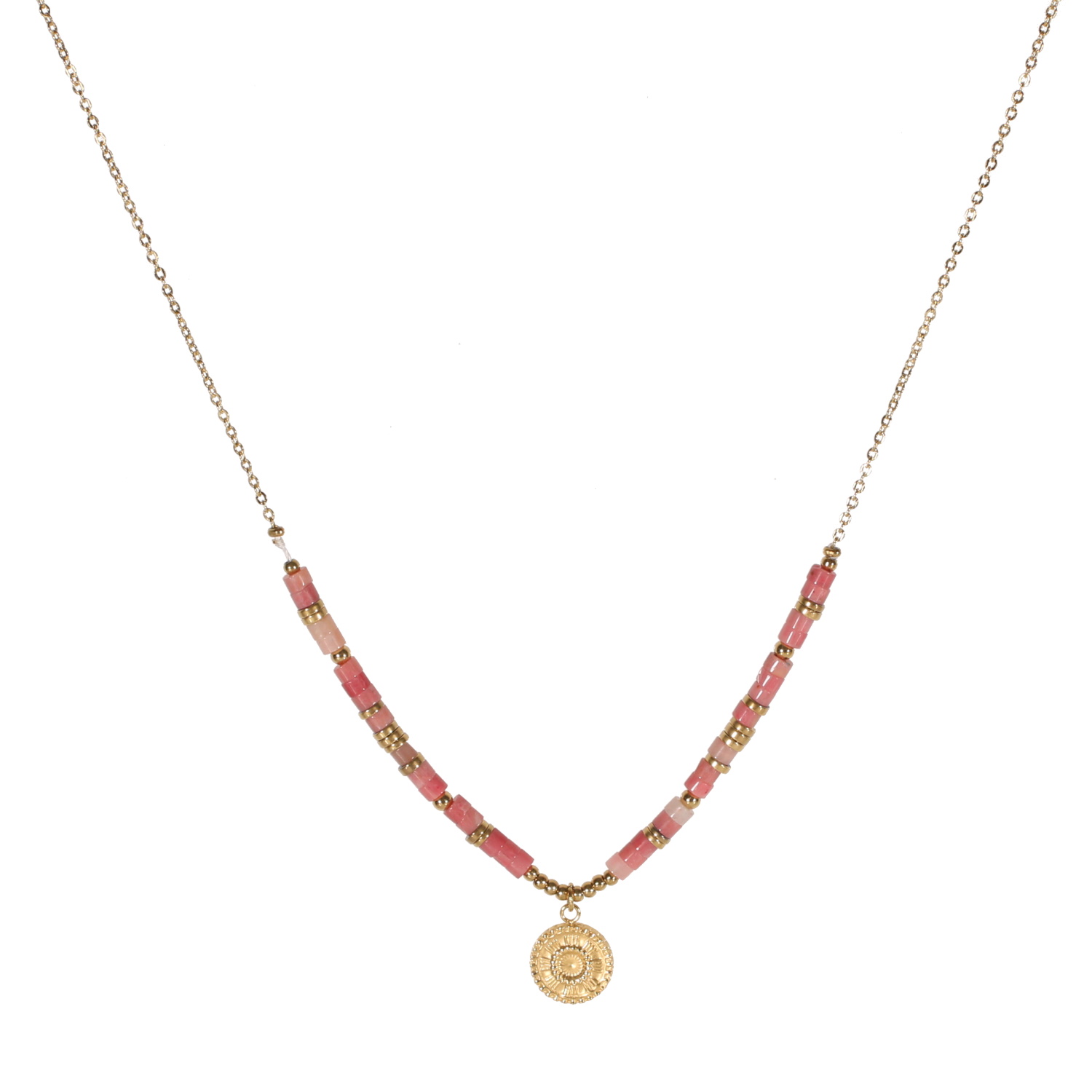 Collier composé d'une chaîne et de perles cylindriques en acier doré, de perles cylindriques en véritable pierre de rhodonite et d'un pendentif rond avec motif en acier doré.