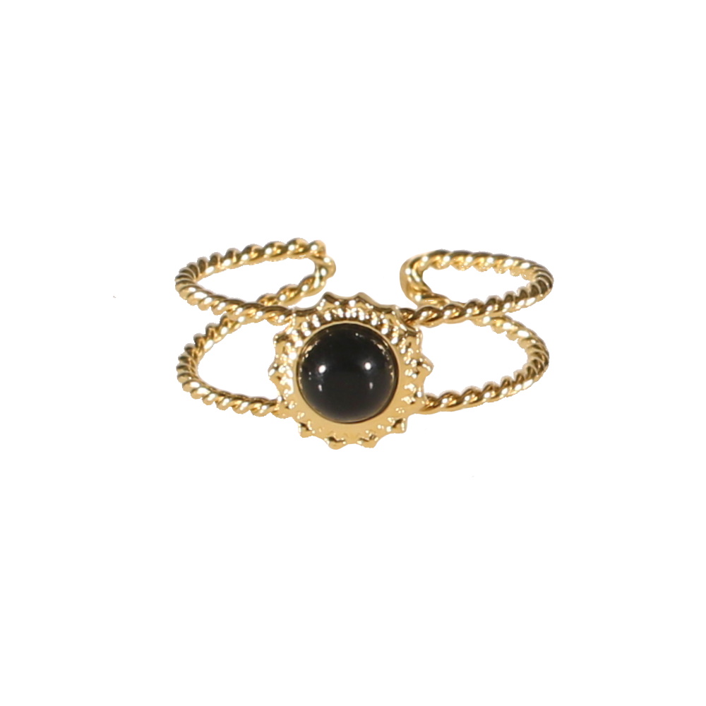 Bague double rangs avec une pastille ronde en forme de soleil en acier doré surmontée d'une véritable pierre d'agate noire.