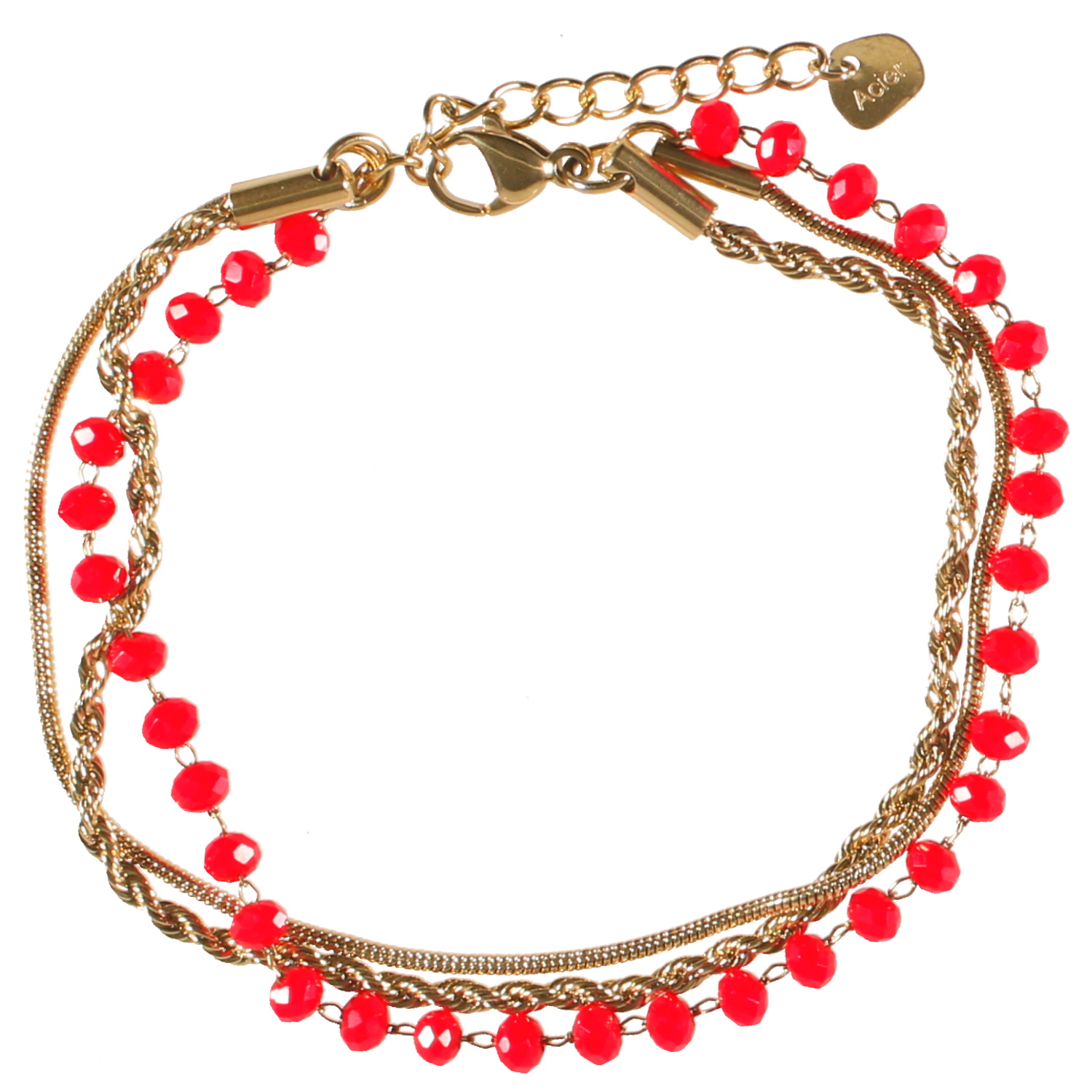 Description Bracelet triple rangs composé de deux chaînes en acier doré et une chaîne de perles de couleur rouge. Fermoir mousqueton avec 3 cm de rallonge. Longueur 17+3 cm [Guide des tailles] Largeur 7 mm Matière(s) Acier , Rocaille . L'acier utilisé dans la bijouterie existe sous plusieurs qualités. Nous utilisons principalement la qualité 316L, qualité qui est utilisée en chirurgie. Cet acier est donc inoxydable et reste très résistant. Fermoir Mousqueton Couleur(s) dominante(s) Doré , Rouge Public Adolescent , Adulte . Genre Femme , Fille . Saison Indémodable . Cliquez sur une matière, un thème, une couleur ou une collection pour voir tous les articles associés.
