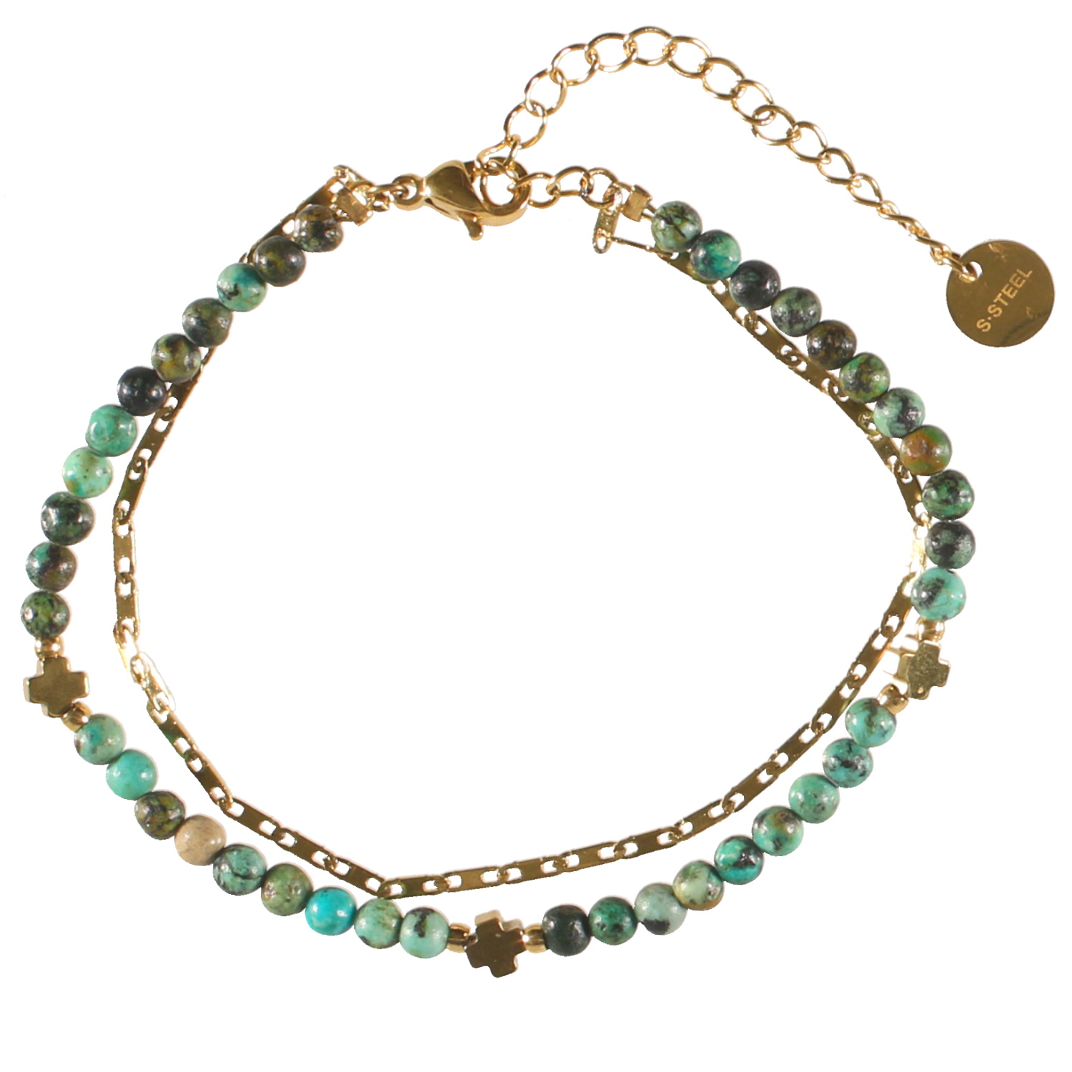 Bracelet double rangs composé d'une chaîne en acier doré, ainsi qu'un bracelet de perles de couleur vert et de trois croix en acier doré.