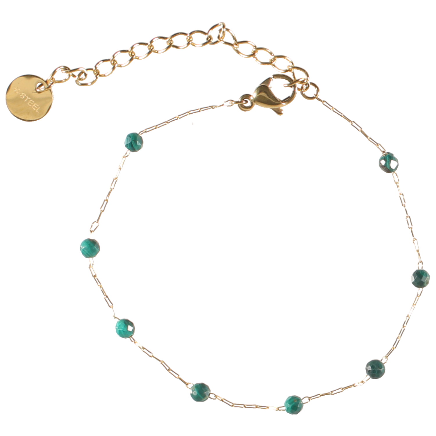 Description Bracelet composé d'une chaîne en acier doré et de perles de couleur verte. Fermoir mousqueton avec 5 cm de rallonge. Cliquez sur une matière, un thème, une couleur ou une collection pour voir tous les articles associés.